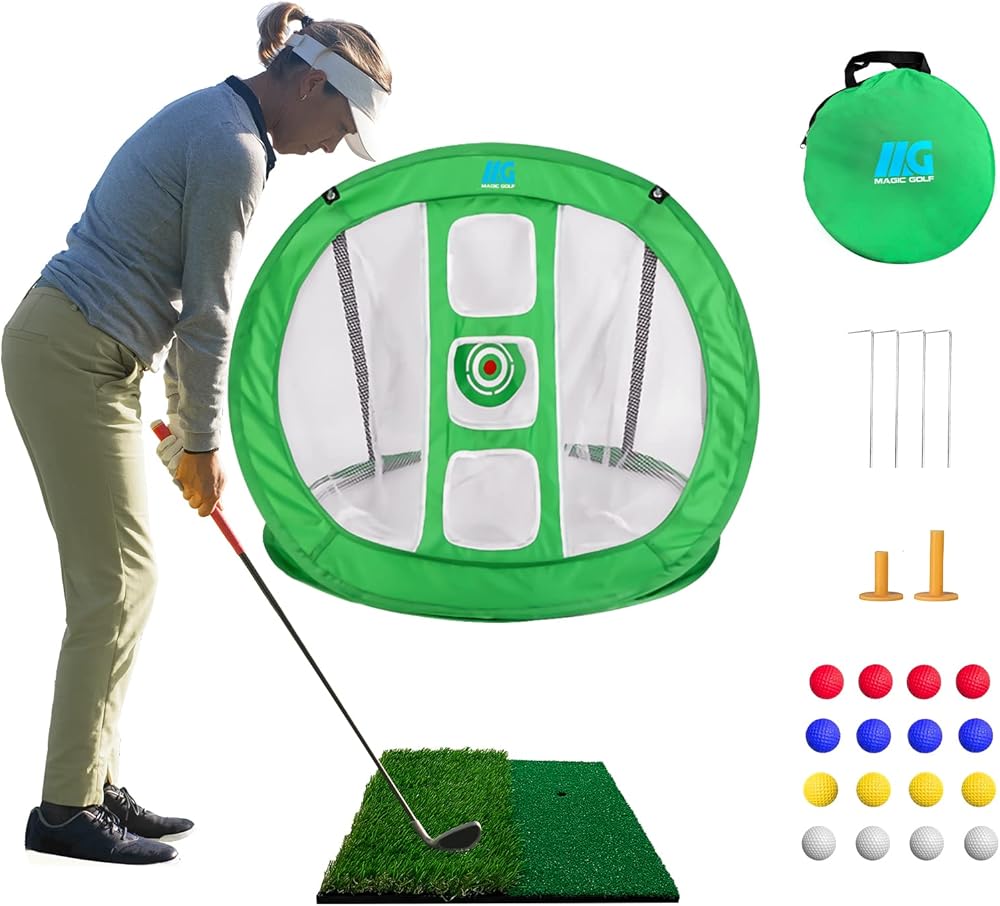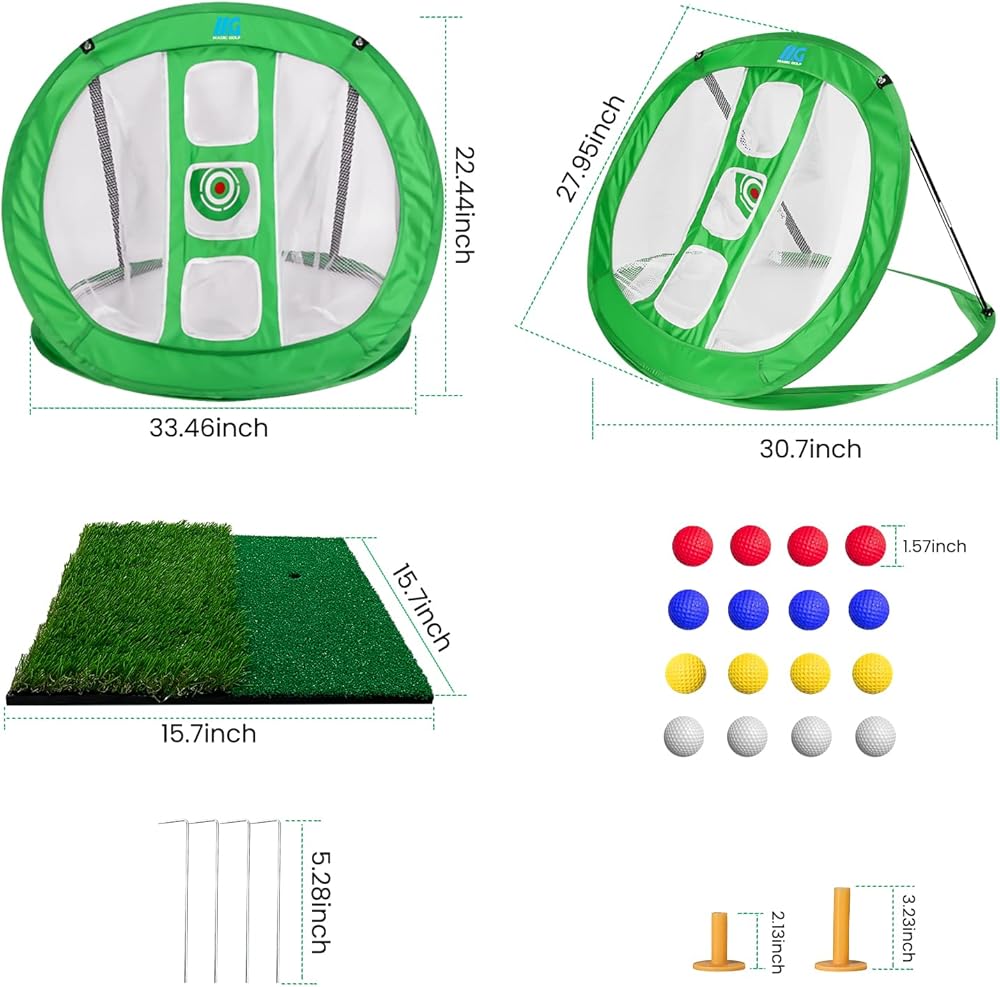 شبكة تقطيع منبثقة مع مجموعة بساط ضرب العشب في الأماكن المغلقة والمفتوحة - 3 شبكة تدريب على ضرب الجولف مستهدفة - هدية - 16 كرة لتمرين الجولف و4 أوتاد أرضية، مع حقيبة