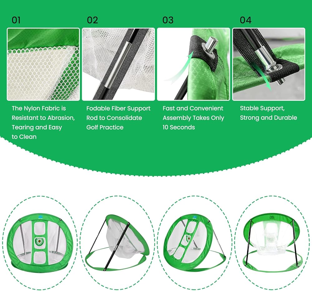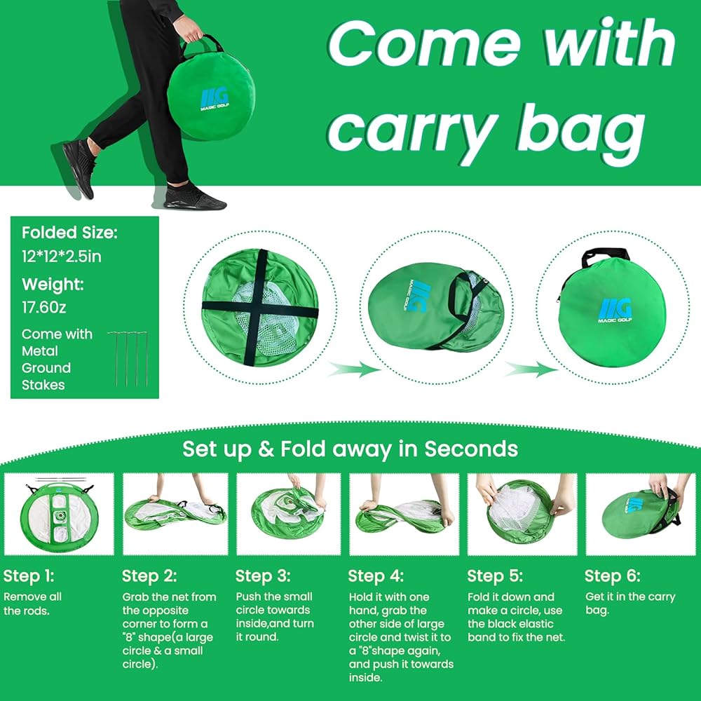 【إعداد محمول وفوري】يمكن طي شبكات تقطيع الجولف هذه في ثوانٍ لتناسب حقيبة محمولة، حتى تتمكن من اصطحاب متعة لعب الجولف إلى منزلك أو مكتبك أو الحفلات أو المدرسة أو الفناء الخلفي! التصميم المنبثق مناسب للتدريب واللعب مع الأصدقاء والعائلة والزملاء في أي وقت وفي أي مكان. لا حاجة للذهاب إلى الأندية الرياضية المحترفة وملاعب الجولف في كل مرة.