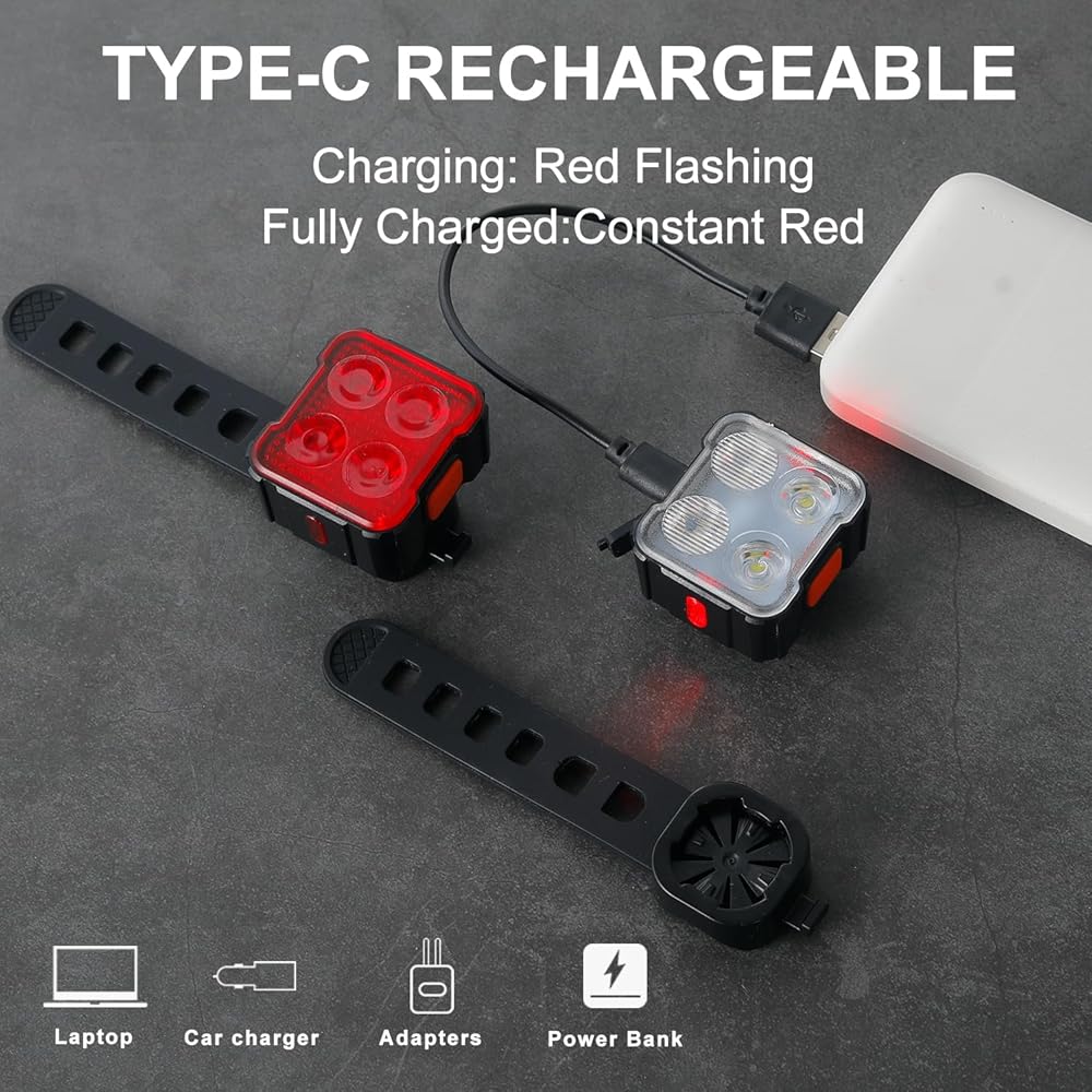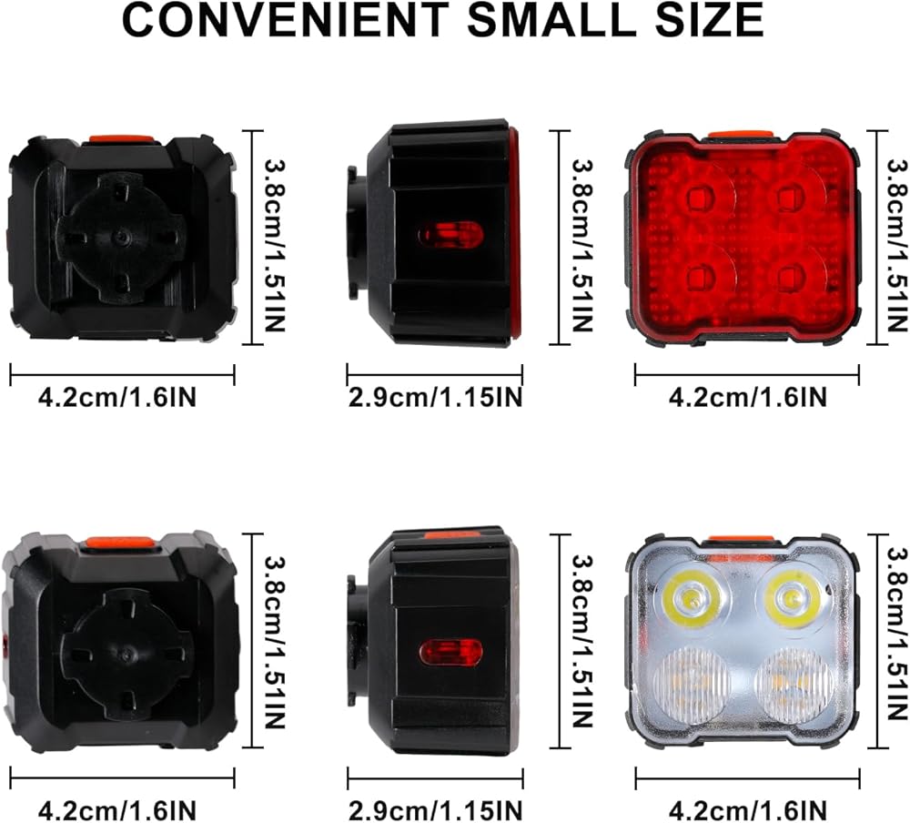 Include 2 headlights and 2 taillights. USB RECHARGEABLE: Bike Headlight: 300lm, Taillight: 200lm, Battery: 300mah. Encased in each light a lithium battery, type-C interface for fast, convenient charging. Usually, bright (maximum brightness) can last 1.5-2h.