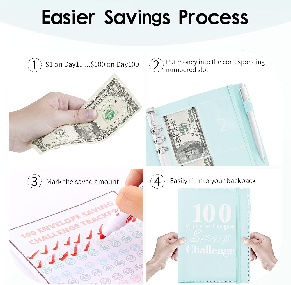 ساعد في بناء عادة الادخار: باستخدام أداة تعقب الادخار، يمكنك بسهولة تتبع تقدم مدخراتك. ألصق الملصقات من 1 إلى 100 على جيبك، واختر رقمًا، ثم ضع النقود في الحقيبة المقابلة. على سبيل المثال، إذا اخترت الرقم 52، فيجب عليك وضع 20 دولارًا في الكيس 20. يمكن تنظيم جميع المظاريف النقدية المستخدمة في إعداد الميزانية في مجلدات الميزانية لمساعدتك في تحقيق أهداف ميزانيتك.