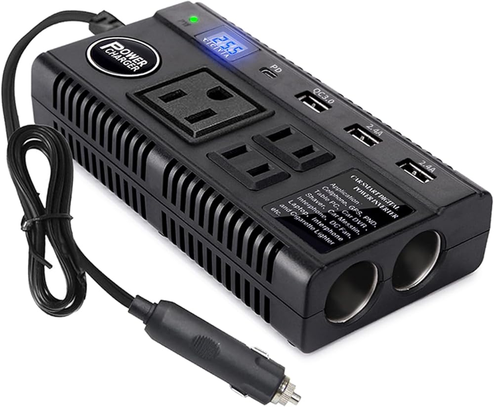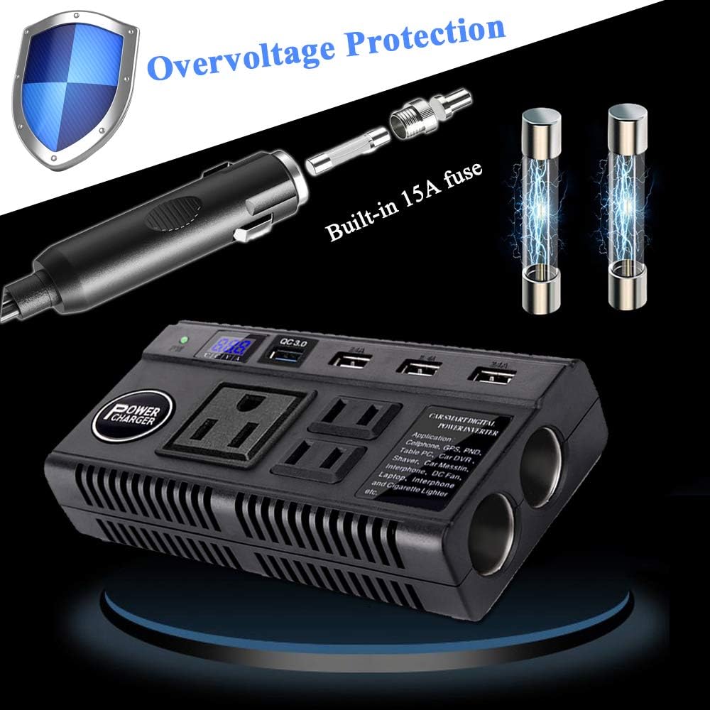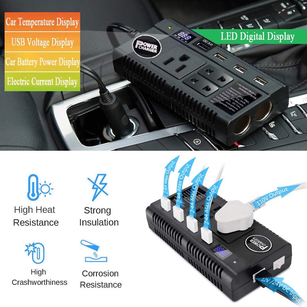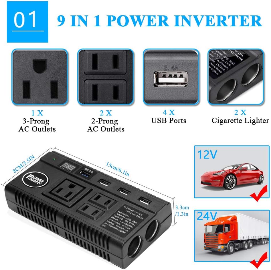 🌟محول طاقة سيارة ممتاز بقدرة 120 وات مع 4 منافذ USB (شحن سريع: تيار إخراج USB: 2.4 أمبير*2+2.4 أمبير*2)، منافذ 3 تيار متردد، ولاعة سجائر مزدوجة وشاشة عرض ذكية. يوفر عاكس الطاقة متعدد الوظائف مصدر طاقة لجهاز الكمبيوتر المحمول ومشغلات DVD والأجهزة الإلكترونية الأخرى.