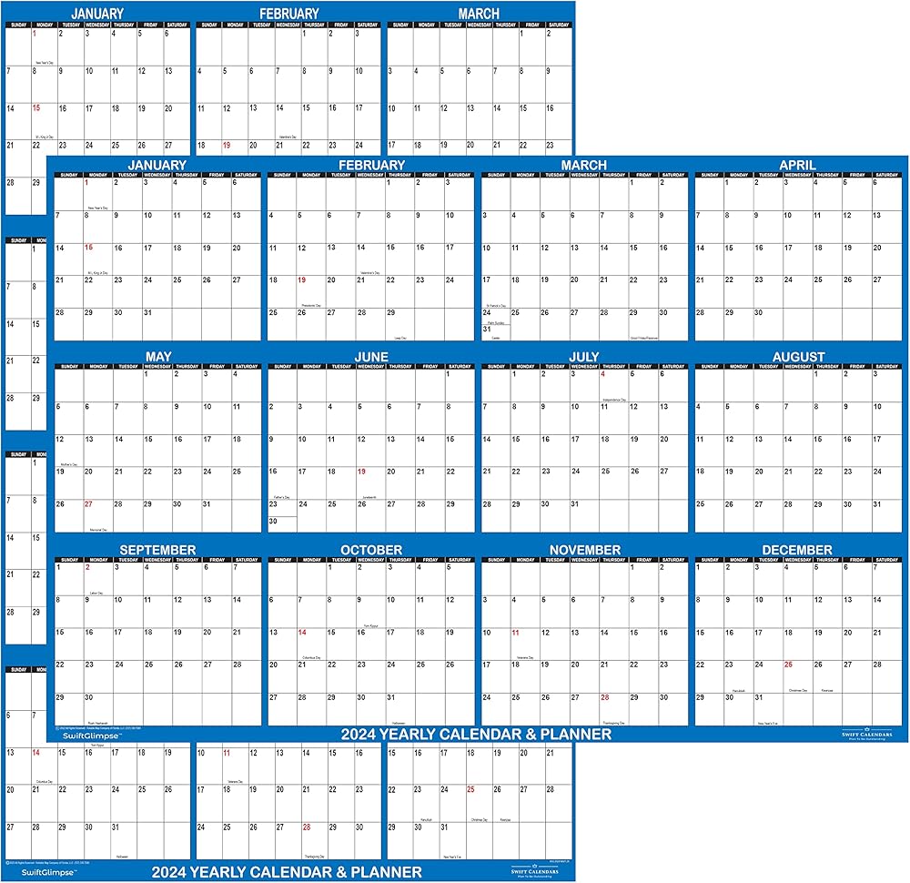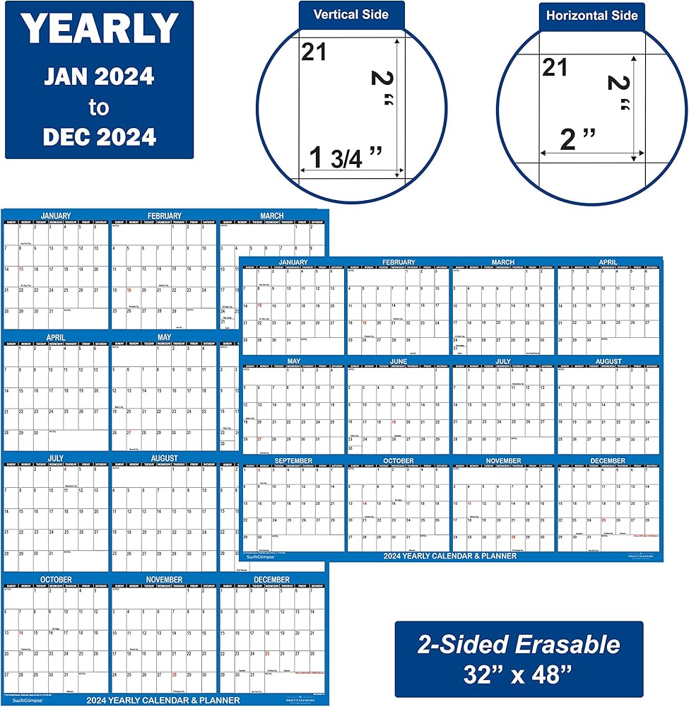 تقويم حائط SwiftGlimpse 2024 مقاس 32 بوصة × 48 بوصة، قابل للمسح، مقاس كبير XL، مسح رطب وجاف، مصفح، مخطط حائط سنوي سنوي لمدة 12 شهرًا، قابل للعكس، أزرق داكن