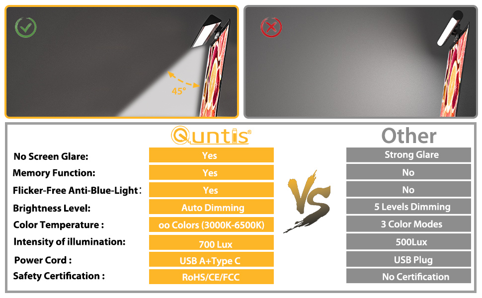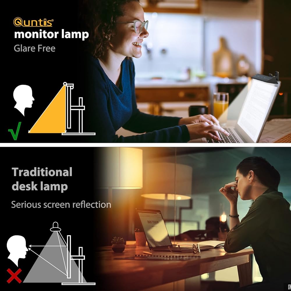 ✅[تصميم مضاد للضوء الأزرق بدون وهج الشاشة وخالي من الوميض] يتميز شريط إضاءة الشاشة Quntis بتصميم بصري غير متماثل يضيء لوحة مفاتيح الكمبيوتر فقط، ويزيل الوهج العاكس عن الشاشة الموجود في معظم مصابيح المكتب العادية. بفضل نظام حماية العين المتقدم، تحجب مصابيح المكتب المنزلية لدينا الضوء الأزرق والإشعاع البصري، مما يخفف بشكل فعال من إجهاد العين لحماية عينيك. تعظيم التركيز والراحة سواء كنت تعمل أو تسترخي.