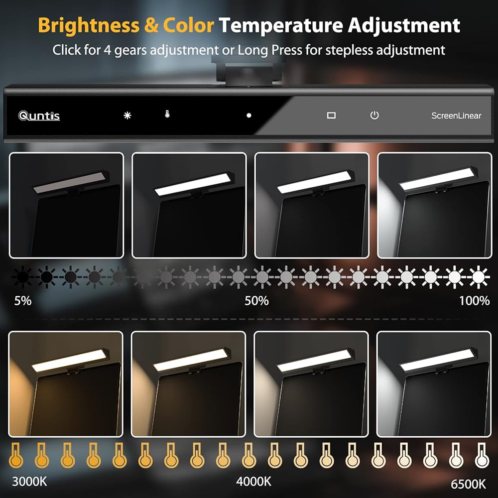 ✅[ضبط بدون خطوات و4 تروس] يتيح لك ضوء شاشة المكتب الخاص بنا ضبط السطوع ودرجة حرارة اللون يدويًا عن طريق النقر لتعديل 4 تروس أو الضغط لفترة طويلة على مفتاح التعتيم بدون خطوات. يتيح لك تعديل درجة حرارة اللون بدون خطوات 3000K-6500K التبديل بين الضوء البارد والضوء الدافئ حسب الرغبة من أجل بيئة عمل مريحة طوال اليوم.