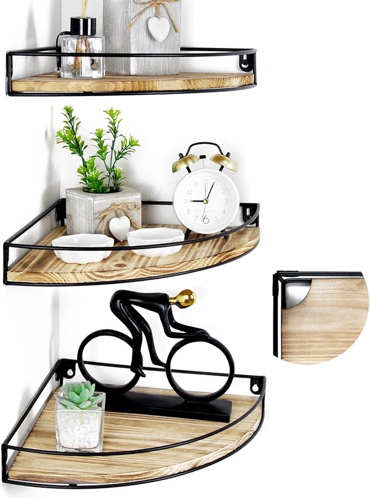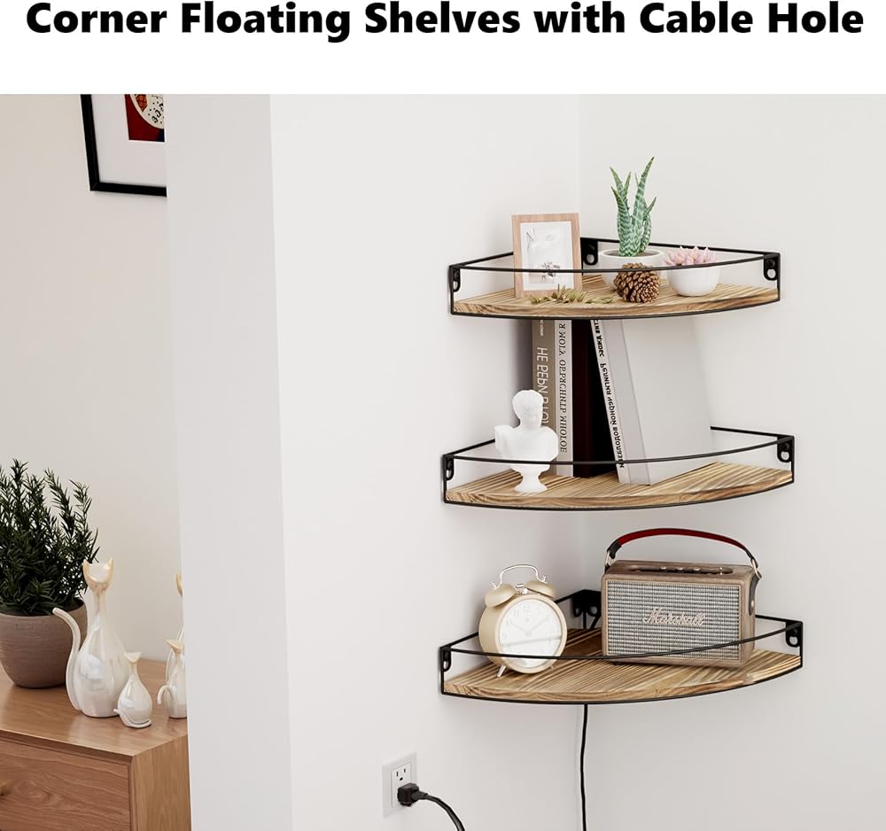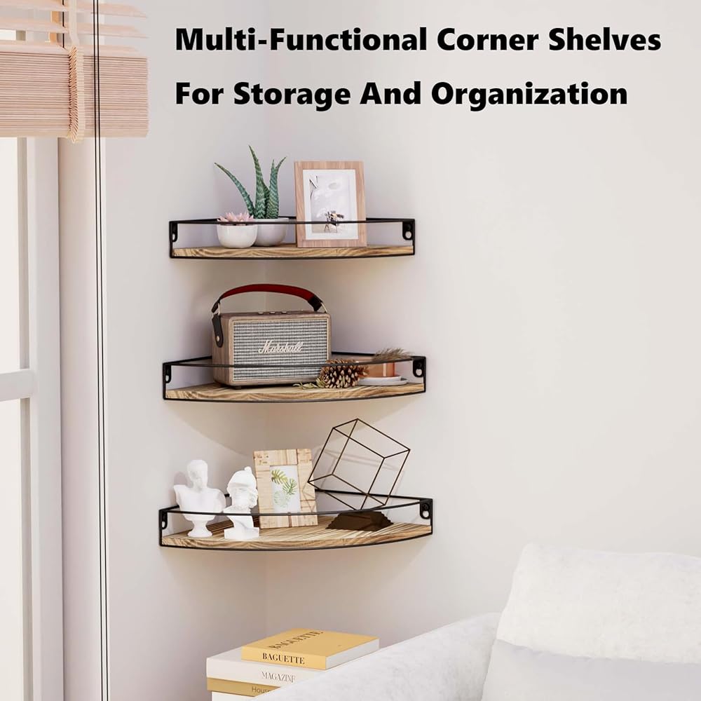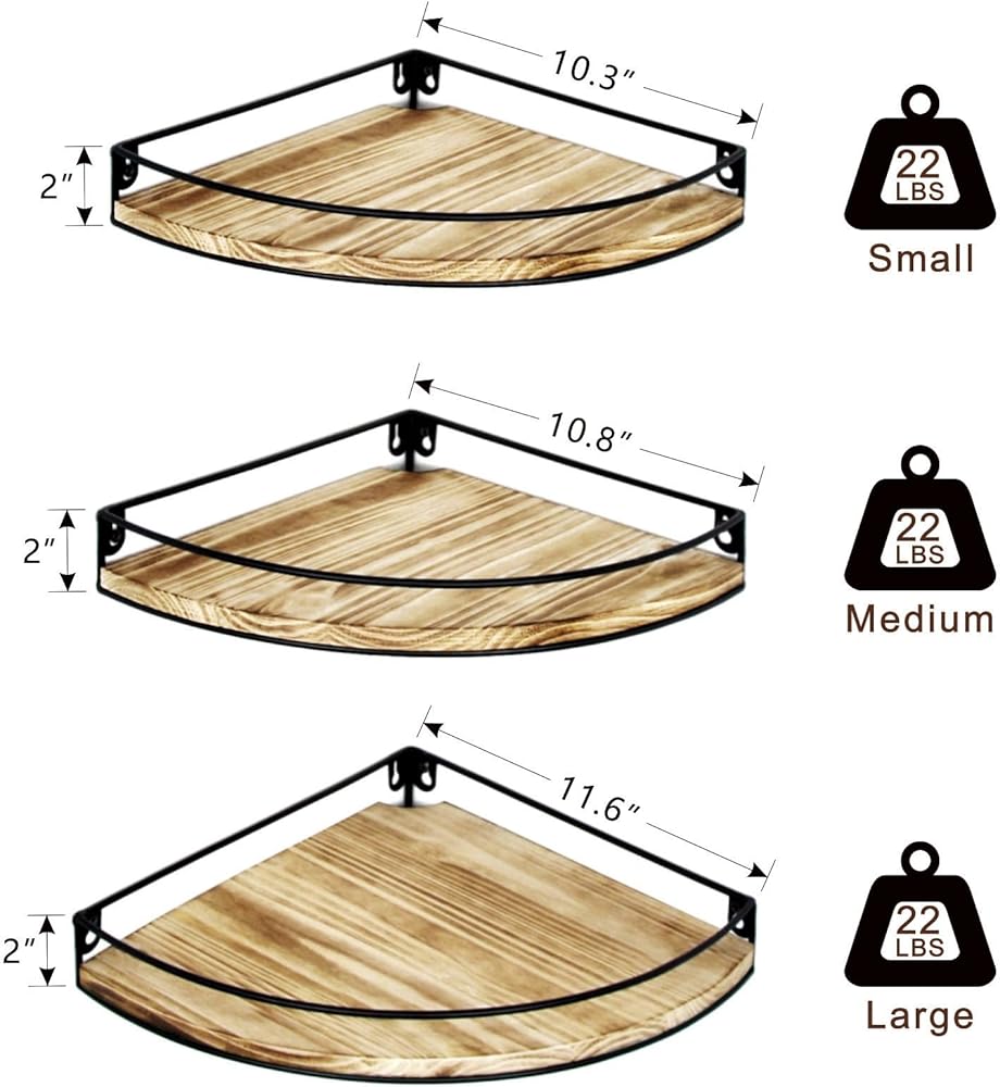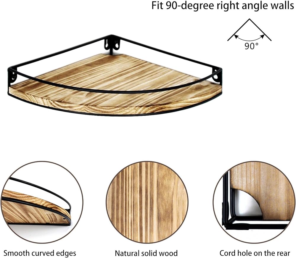 【مواد متينة】أرفف الزوايا العائمة لدينا مصنوعة من الخشب الصلب وإطارات معدنية صناعية ذات قدرة تحميل ممتازة. تعمل حواجز الحماية على منع العناصر من السقوط من رف الزاوية بشكل فعال