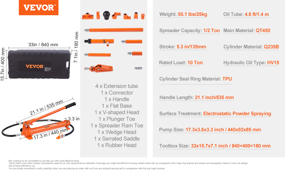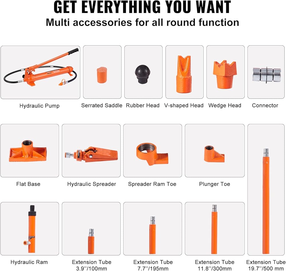 • Fit All Your Needs: Our portable hydraulic ram kit is an all-inclusive package for your repair works. Hydraulic pump, hydraulic ram, 4pcs extension tubes, serrated saddle, rubber head, V-shaped head, wedge head, connector, flat base, hydraulic spreader, spreader ram toe, plunger toe. Empower yourself to tackle any project effortlessly and confidently.