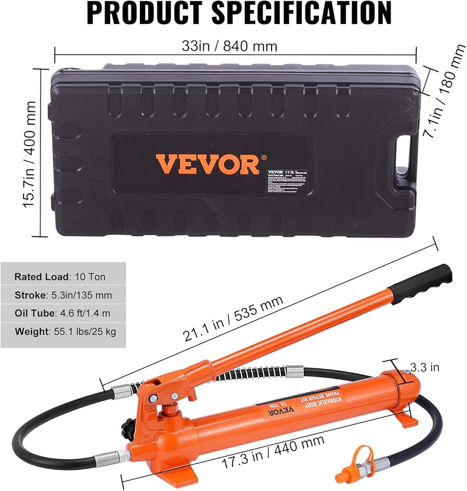 • Boost your Bull-Work Efficiency: Elevate your productivity with the VEVOR 10-ton hydraulic porta power kit. This robust solution caters to all your repair demands. Its advanced automatic overload system safeguards equipment and rams, while the 1/2 ton hydraulic spreader simplifies repair tasks. Embrace the power of efficiency today!