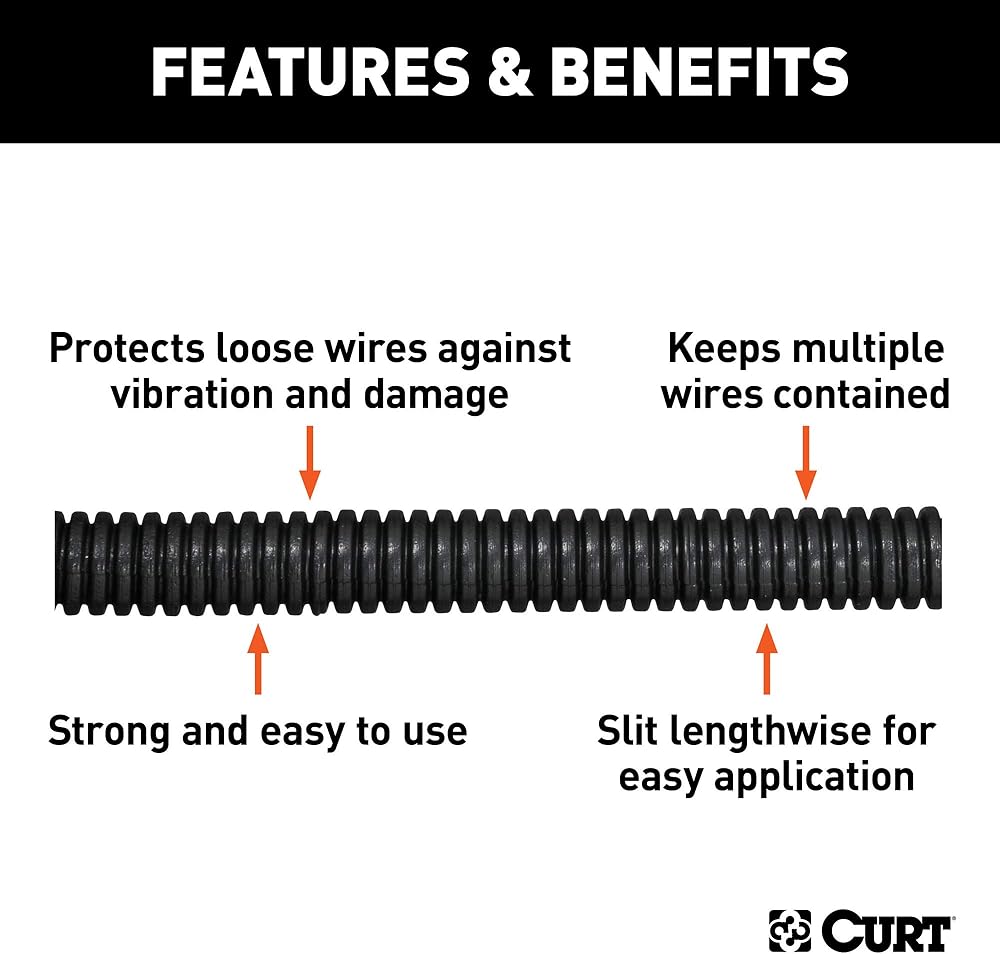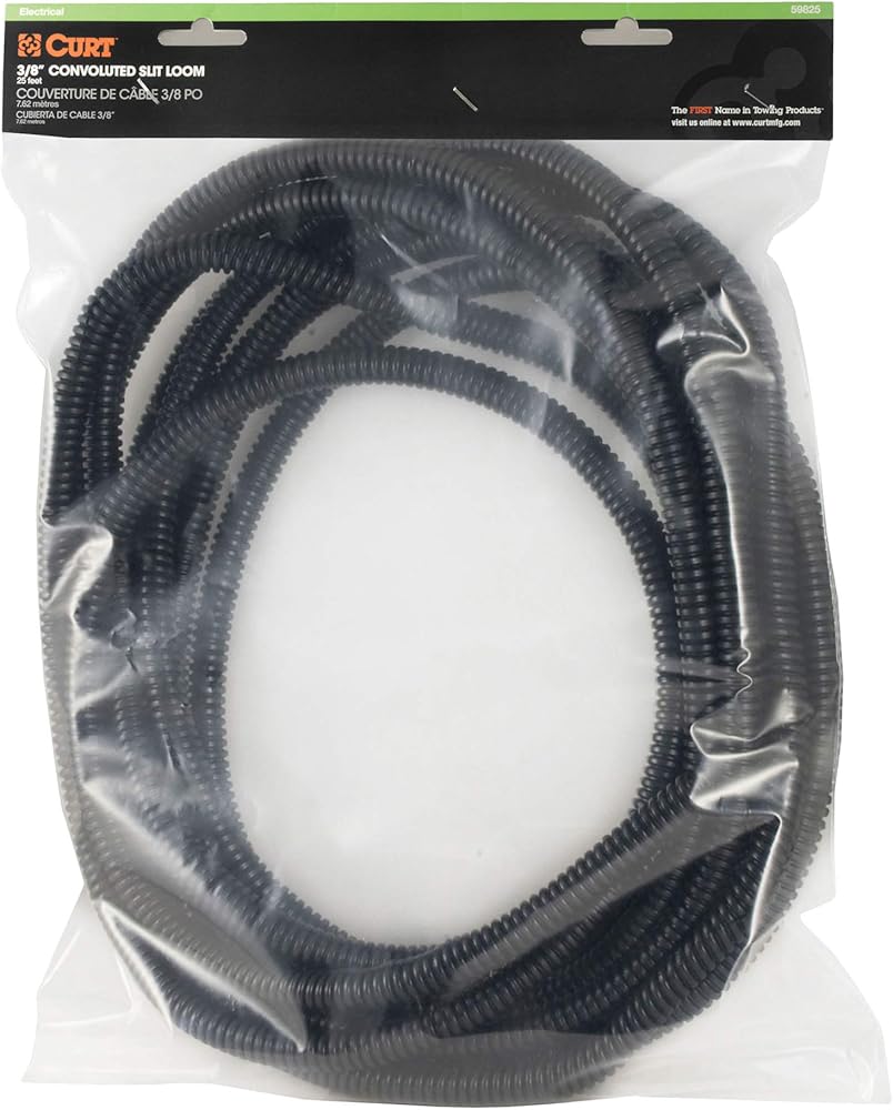 Whether you're a contractor on your way to the jobsite or just a casual fisherman heading to the boat landing, you need working trailer lights to tow safely and legally. For any towing setup, CURT offers quality wiring components, including complete wiring kits, circuit breakers, wiring connectors and more. Protect a wiring harness or length of wires from damage with this convoluted slit loom tube. It offers a 3/8" diameter to fit multiple wires and features a durable plastic construction to protect loose wiring from vibrations, crushing and exposure to the elements. This package includes 25' of tubing and can be trimmed to any length needed.