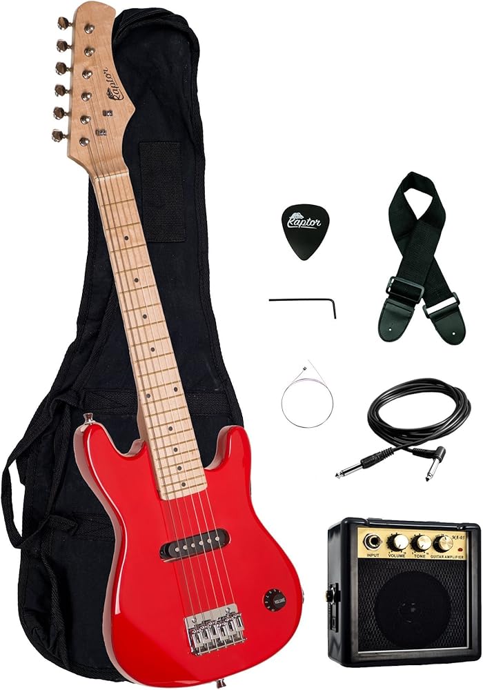 Everyone has to start somewhere and the raptor ep3 pack is your child's ticket to rock stardom the ep3 measures 30" in length and is constructed of light weight solid basswood body, making it fit well in your kid's hands. It's equipped with a single coil pick up and a fixed bridge for awesome rock tones and vibes. Pack comes complete with an amp and accessories.