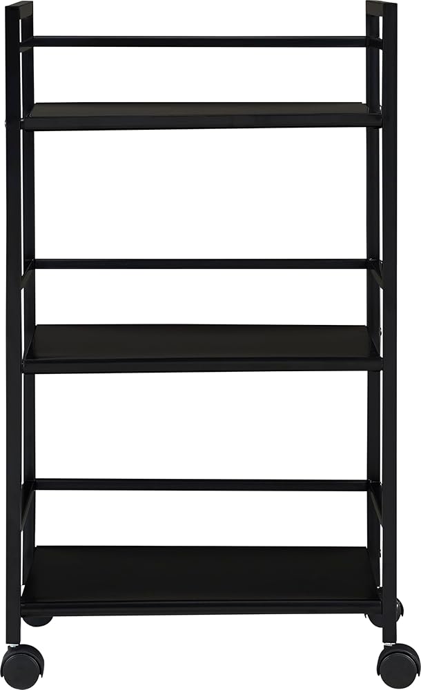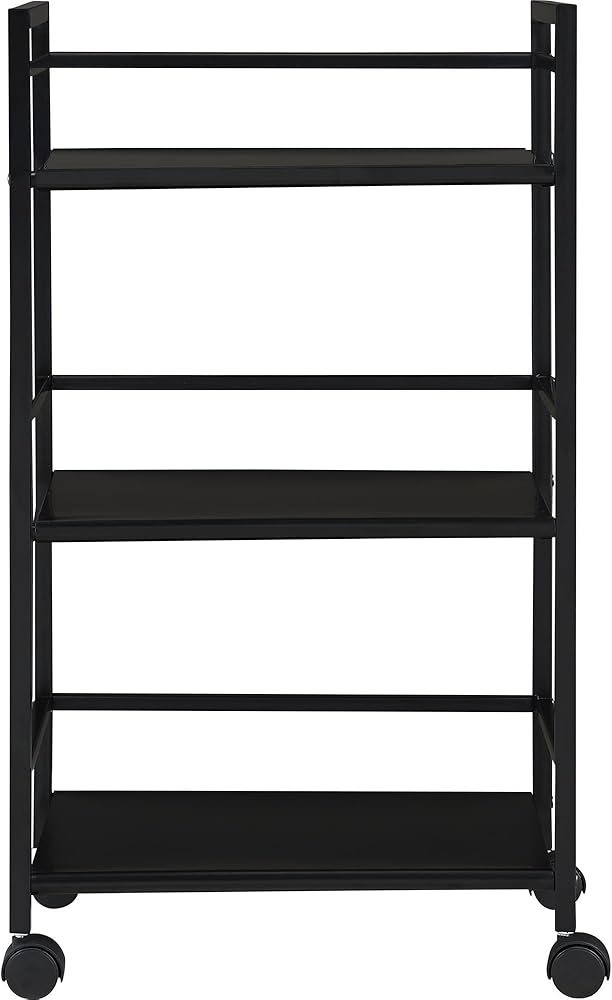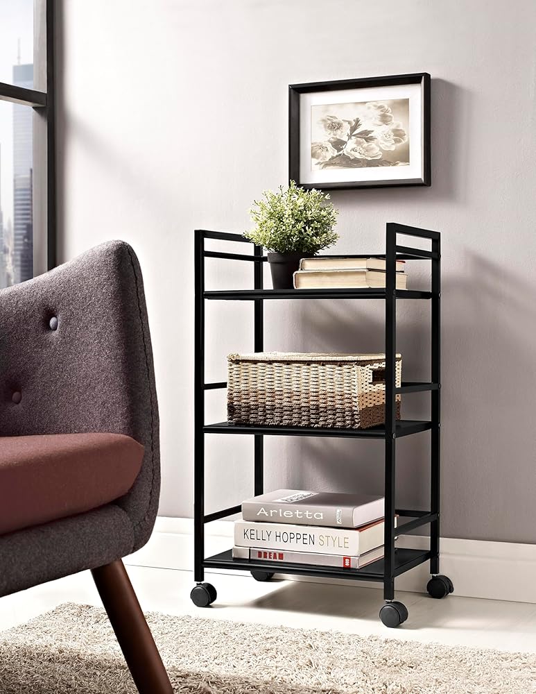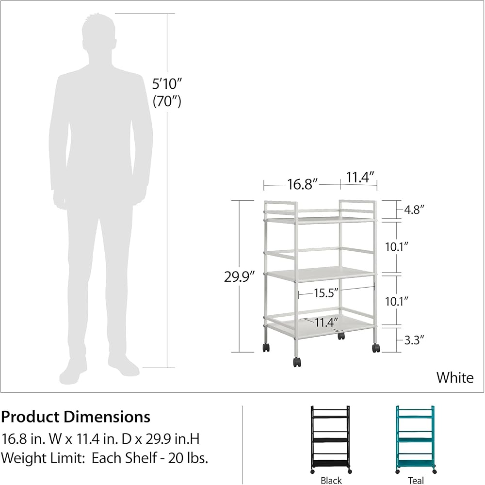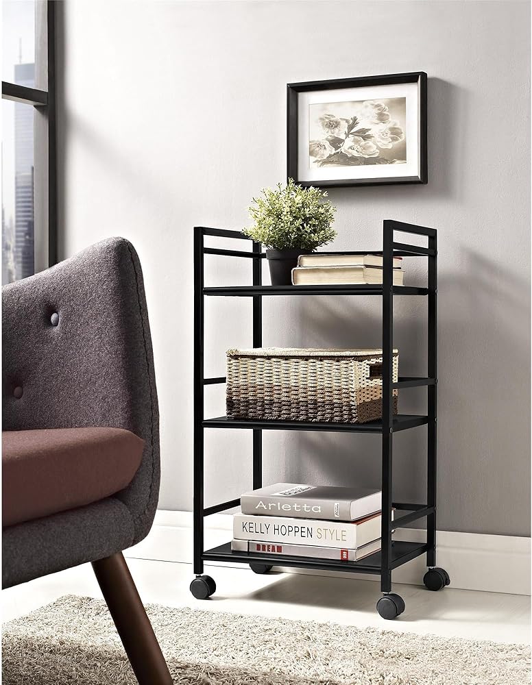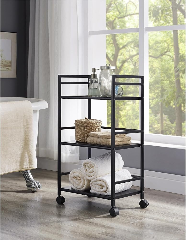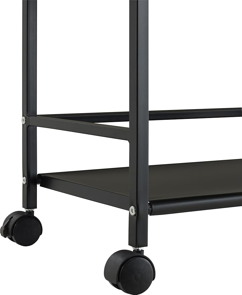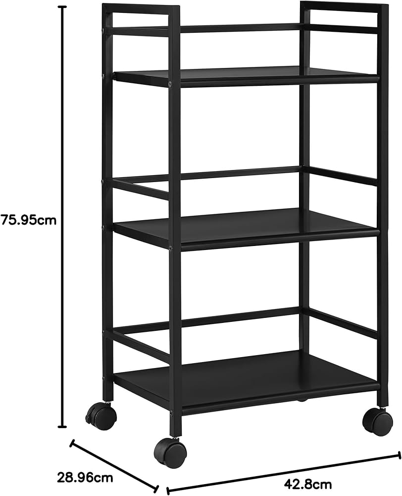 From the living room to the bathroom to the kitchen and beyond, the Ameriwood Home Marshall 3 Shelf Metal Rolling Utility Cart is a great addition to your home. Featuring a minimalistic style, the cart has 3 large shelves. Each shelf has 3 wraparound bars and can hold up to 20 lbs. Easily roll the cart from room to room on the 4 casters, 2 of which lock into place. Thanks to the black powder-coated metal finish, it will look great with any color scheme. Assembly is required, and the final dimensions are 29.9"h x 16.85"w x 11.4"d.