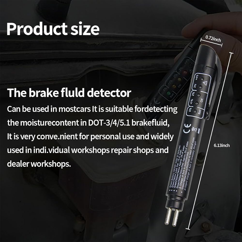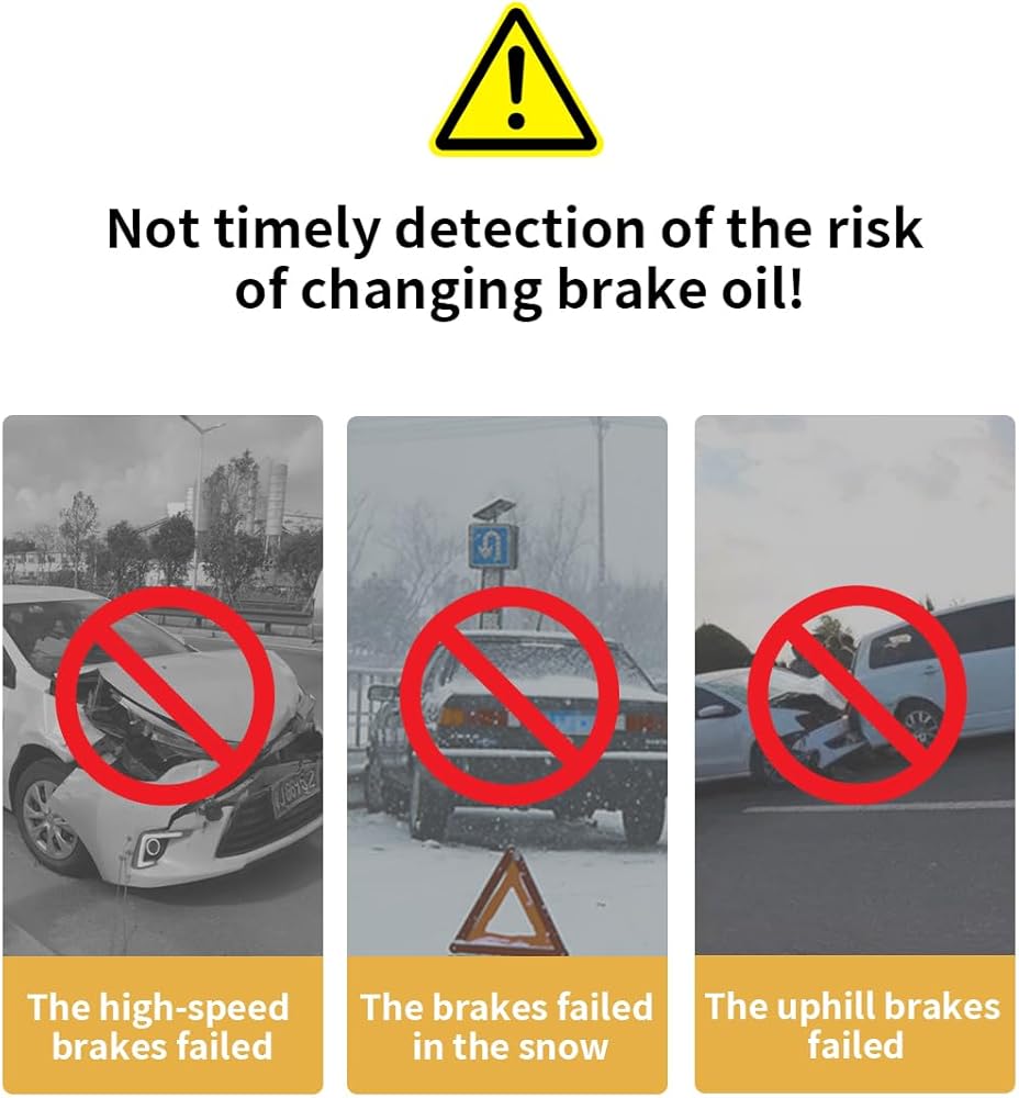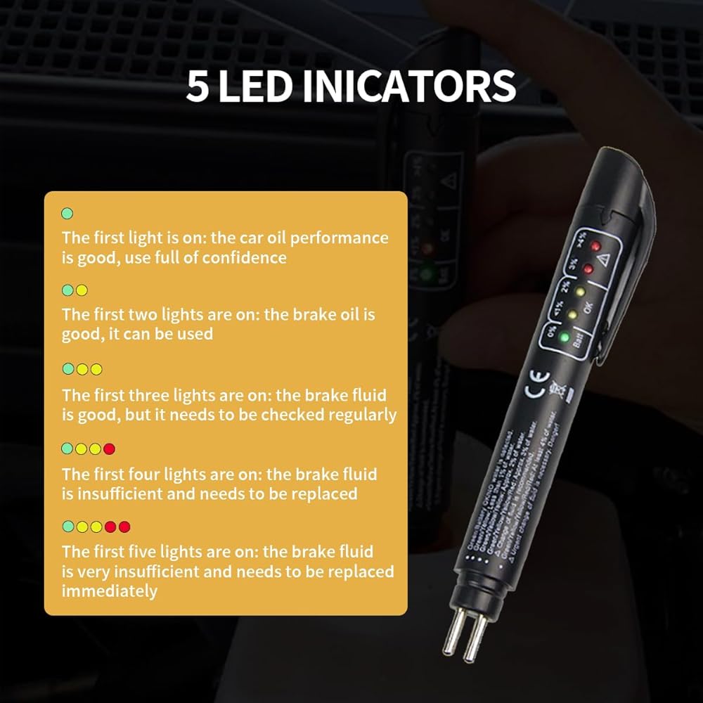 • ¡¾القيادة الآمنة¡¿: يتضمن جهاز اختبار سائل الفرامل 5 مؤشرات LED تعرض نسبة الرطوبة في سائل الفرامل. باستخدام هذا المنتج، يمكنك التحقق على الفور من حالة سائل الفرامل، والحصول على نتائج اختبار أكثر دقة، وتلقي تذكيرات لاستبدال سائل الفرامل عند الحاجة. وهذا يساعدك على تجنب أي حوادث طرق محتملة.