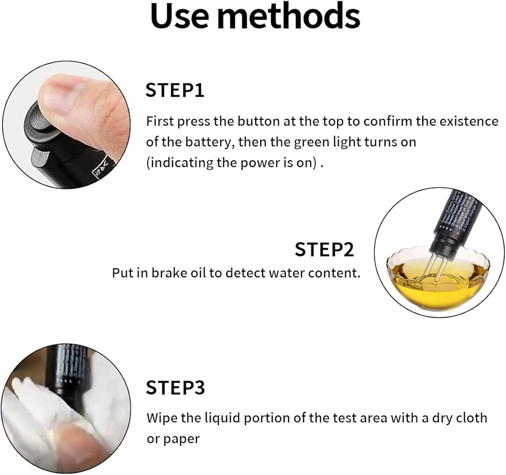 • ¡¾سهل الاستخدام¡¿: كاشف سائل الفرامل سهل الاستخدام وصغير الحجم ومحمول. ما عليك سوى الضغط على الزر، وإدخال قلم الاختبار، وفي غضون ثوانٍ سيعرض مؤشر LED النتائج. للحفاظ على الطاقة، يتم إيقاف تشغيل الكاشف تلقائيًا بعد 20 ثانية من عدم النشاط.