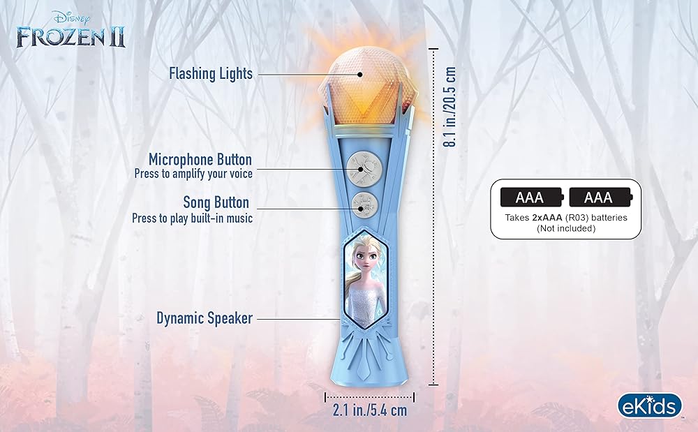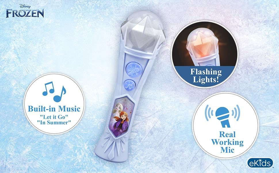 هل تريد بناء رجل ثلجي؟ قم بغناء قلبك بأي أغنية تريدها من خلال توصيل مشغل ام بي 3 الخاص بك. أو يمكنك الغناء مع الموسيقى المدمجة. كن النجم في أدائك الخاص وانطلق. ستكون آنا وإلسا معكِ عندما تمارسين لأنهما على ميكروفونك.