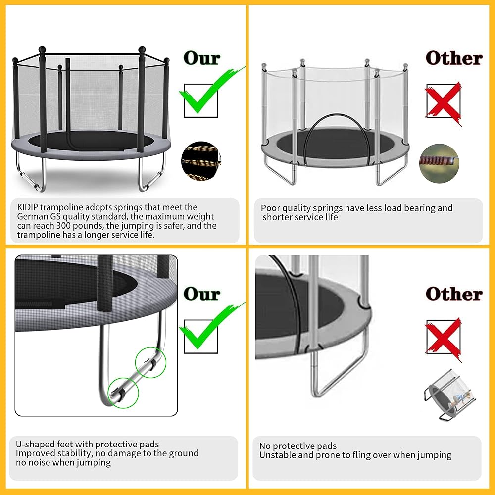 مريح وعملي: ترامبولين الأطفال أو الترامبولين الصغير من KIDIP، أغطية القدم المضادة للقرص ووسادات القدم المخففة للضوضاء مصنوعة من بولي كلوريد الفينيل الآمن غذائيًا، مما يوفر تجربة ارتداد آمنة ومريحة. يمكن استخدام هذا الترامبولين مع حاوية أو الترامبولين مع شبكة في الداخل والخارج.