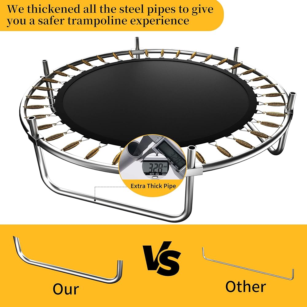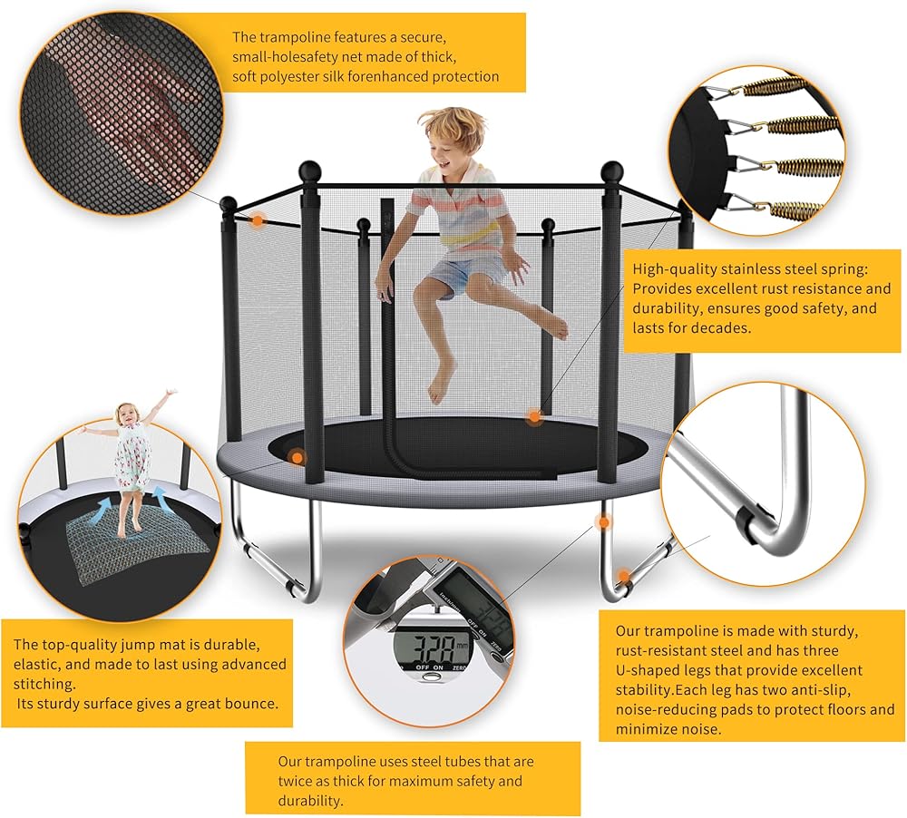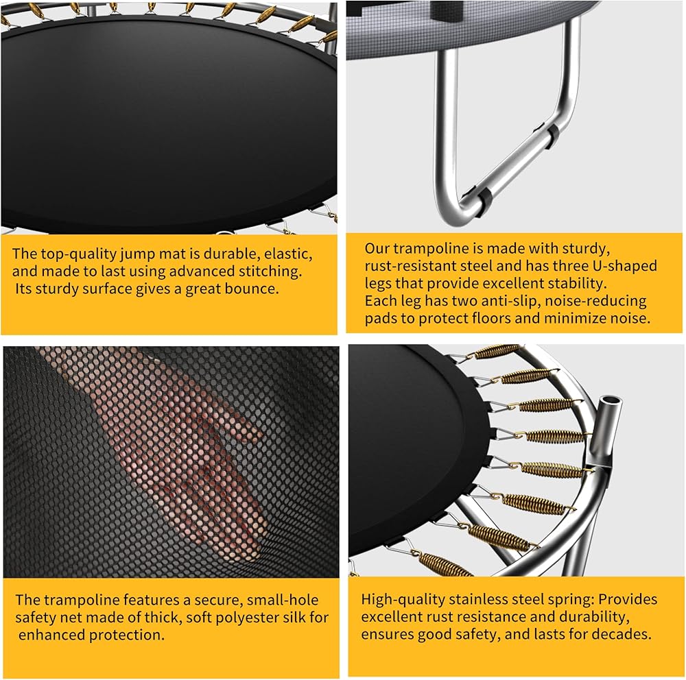 مساحة قفز كبيرة: التصميم الدائري للترامبولين يزيد من استخدام المساحة، مما يوفر مساحة قفز أكبر من أشكال الترامبولين الأخرى، مما يجعلها مثالية للأطفال للقفز بحرية.