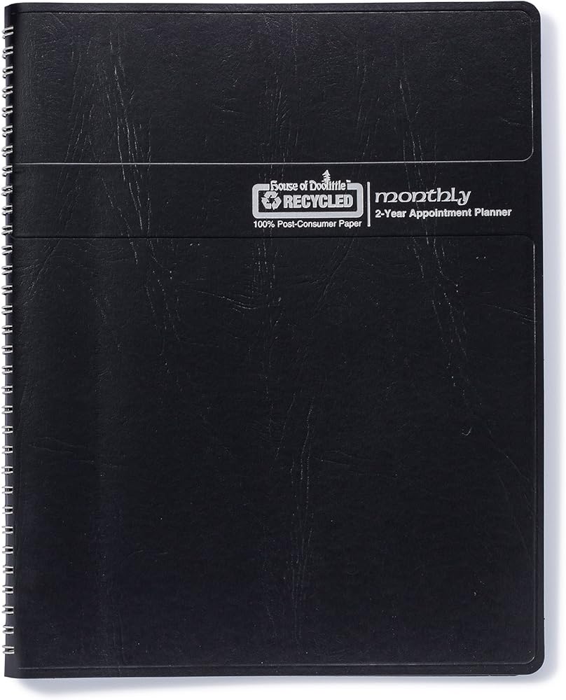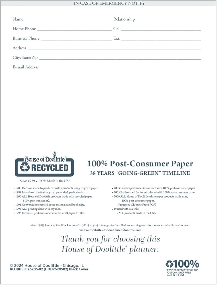 Since 1919, House of Doolittle has manufactured quality dated products made in the United States that help you be more productive during your daily planning activities. In 1989 we made the commitment to produce all of our products using recycled paper and materials. The House of Doolittle 2024 - 2026 Monthly 2 Year Academic Planner has a full monthly view per two-page spread with 2-1/8" x 1-7/8" blocks allocated for each day. Additional features include a 3-year reference calendar page for long-range planning, ample notespace per month to keep you organized, and an additional page with important holiday dates for 3 years. The cover features a black embossed simulated leather finish while strong wire binding keeps the planner intact throughout the years. This personal planner is geared for a teacher, student, mom, dad or any professional who is looking to keep their life and tasks organized. Other products for the teacher or student from House of Doolittle include desk pads, wall calendars, lesson planners, class record books, assignment books, monthly appointment planners and weekly appointment planners. Go Green with House of Doolittle products, as we use 100% recycled paper containing 100% post-consumer waste with soy inks, 50% recycled cover material, and 90% recycled wire. Since 1989 House of Doolittle has donated 5% of its profits to organizations that are working to create a more sustainable environment.