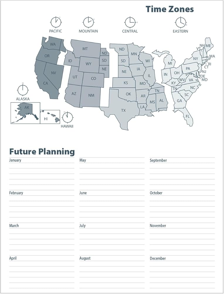 Full monthly view per two-page spread, featuring 2-1/8" x 1-7/8" blocks allocated for each day; Note space for future planning per month to keep you organized