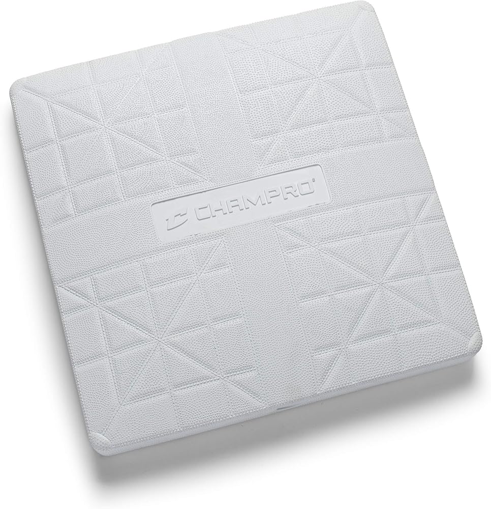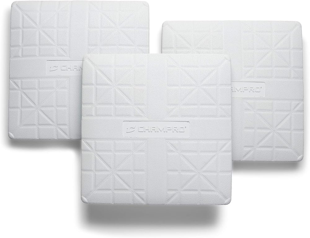 The CHAMPRO Professional Base Set includes 3 durable bases that are made of molded rubber to last longer and enhance player safety on the field. The tough pebble-embossed, UV-resistant rubber prevents metal-spiked shoes from slipping or puncturing the surface. Pillar-style rubber posts provide horizontal flexibility while securing the bases to in-ground steel anchors. This set includes 3 white all-rubber bases, 3 steel ground anchors, 3 rubber posts, and 3 base plugs. Each base in this set measures 15”x15”x3”.