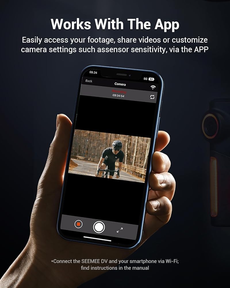 يعمل مع التطبيق: يمكنك الوصول بسهولة إلى لقطاتك أو مشاركة مقاطع الفيديو أو تخصيص إعدادات الكاميرا مثل حساسية المستشعر عبر التطبيق. (* قم بتوصيل SEEMEE DV وهاتفك الذكي عبر Wi-Fi؛ ابحث عنه في الدليل.)