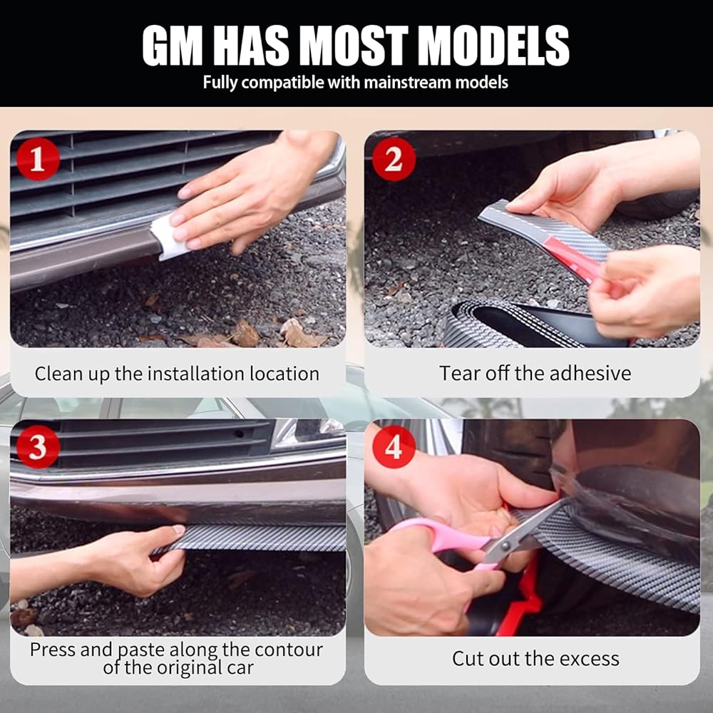• Easy to Install: Clean the underneath with water, peel off the red sticker, press the bumper lip to make sure stick firmly. No drilling or screws are required. You can also use a hair dryer to make the front lip more snug.