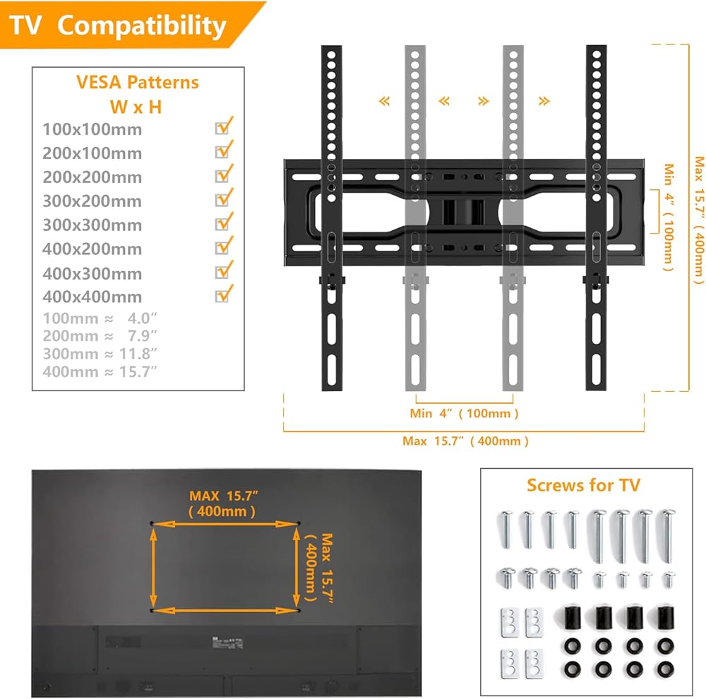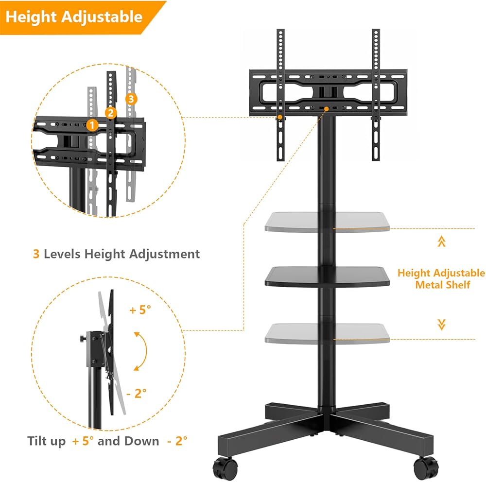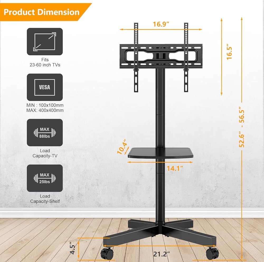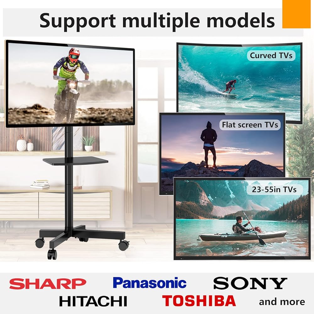 ☝حامل تلفزيون عالمي - حامل التلفزيون المحمول الخاص بنا مصنوع من المعدن يمكنه حمل تلفزيون 23-60 بوصة حتى وزن 88 رطل، متوافق مع Samsung وSony وLG وTCL وHisense وSharp وInsignia وVizio وToshiba وElement و قريباً. يرجى التأكد من أن نمط مسمار VESA الخاص بالتلفزيون الخاص بك يقع بين 100 × 100 مم و400 × 400 مم قبل الشراء.