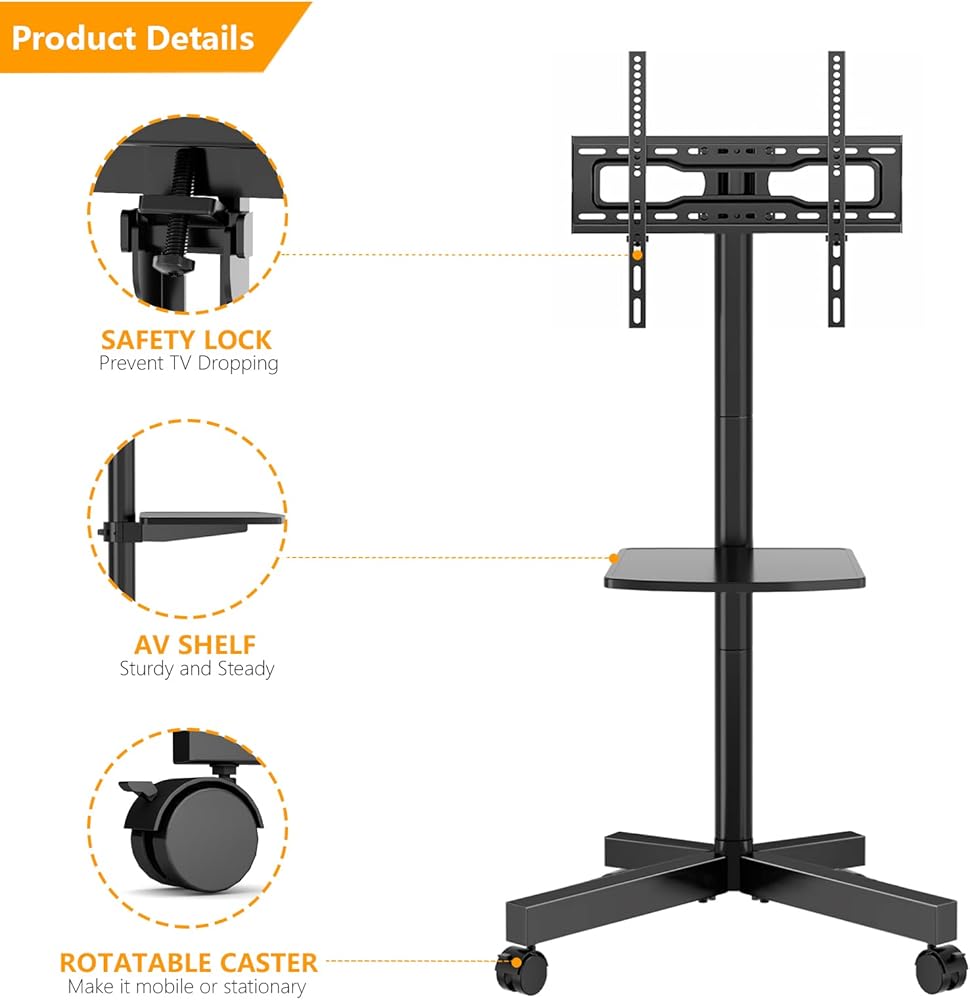 ☝تحرك بسلاسة وسهولة - يسمح لنا حامل التلفزيون المحمول هذا بنقله إلى مناطق مختلفة من الغرفة اعتمادًا على مكان جلوس الأشخاص. العجلات لطيفة والأقفال تتمتع بمقاومة جيدة لها دون صعوبة فتحها لفتحها. أو مغلقة للقفل. يجعل تلفزيونك مركزًا ترفيهيًا متنقلًا.