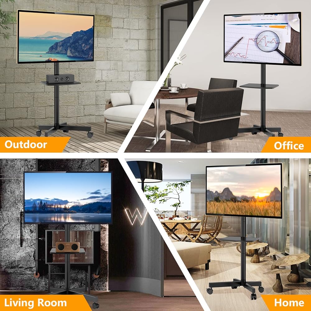☝إضافة مثالية إلى أي مكان - الجودة والمظهر جميلان بما يكفي بحيث يمكنك استخدام عربة التلفزيون هذه في غرفة المعيشة، أو غرفة الطعام، أو المطبخ أو غرفة النوم، أو المنزل أو المكتب، أو في الداخل أو الخارج، حيث قد لا ترغب في إرفاق تلفزيون على الحائط، ولكن ليس لديك حقًا مساحة لقطعة أثاث لتثبيت الشاشة (بالإضافة إلى أنه يمكنك نقل حامل التلفزيون المتحرك من غرفة إلى أخرى إذا أردت!)