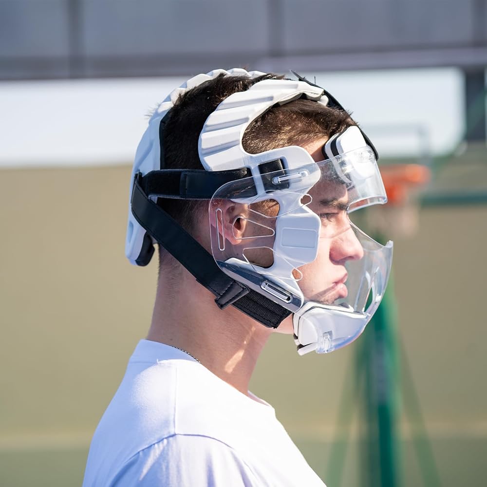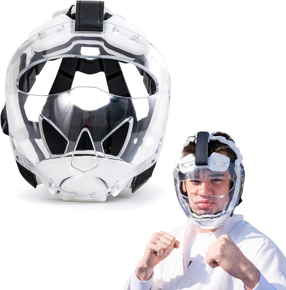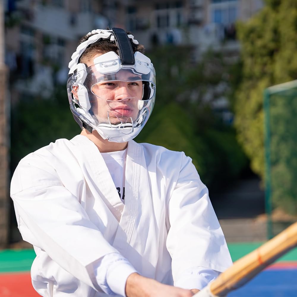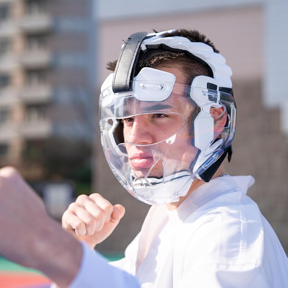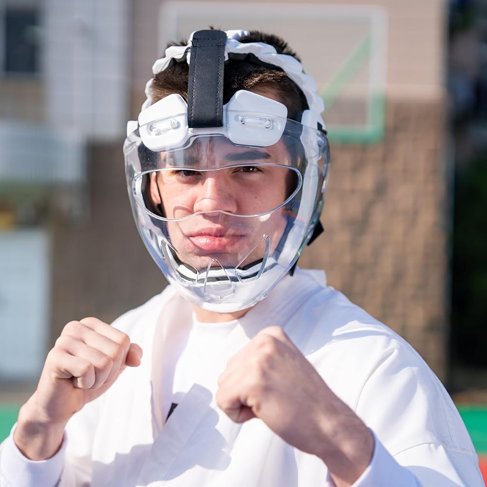 Karate Headgear with Face Shield. Karate sparring gear offers non-removable lightweight clear polycarbonate face shields and offers more peripheral vision. Non-removable helmet mask provides stronger protection for your face.
