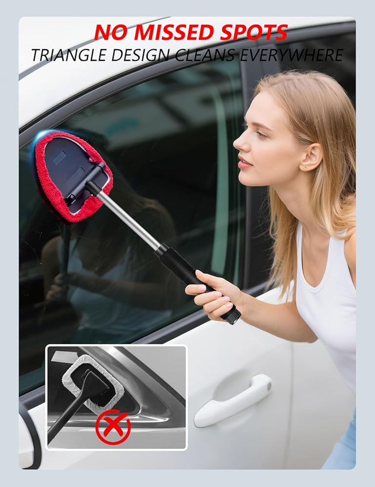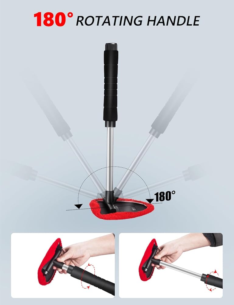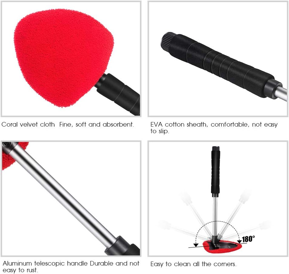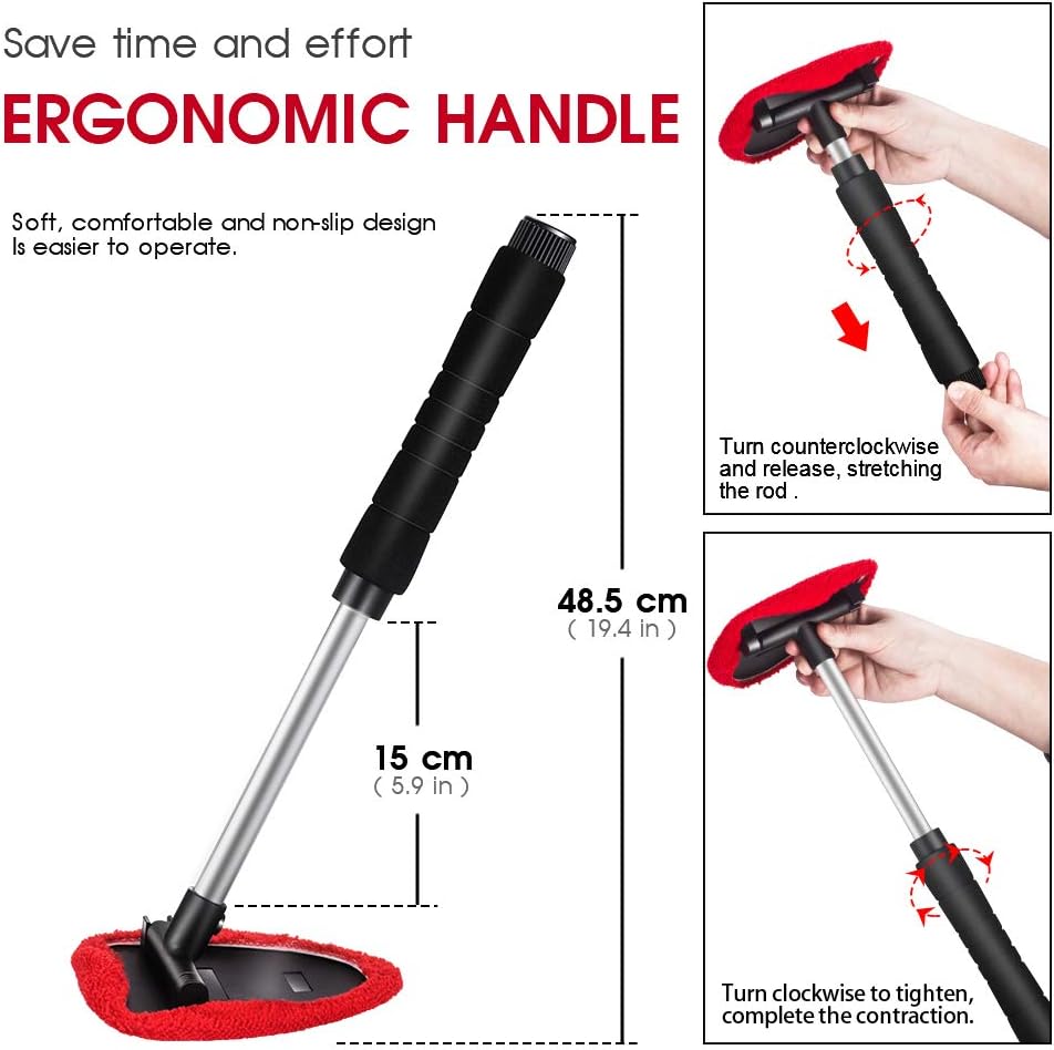 رأس مثلث دوار 180 درجة مع مقبض قابل للتمديد من 7.87 بوصة إلى 13.77 بوصة: يعمل بشكل رائع كأداة لإزالة الضباب والرطوبة. سهل تنظيف الجزء السفلي من نوافذ السيارة أو بعض المناطق التي يصعب الوصول إليها. يمكن للمقبض الطويل تجنب الاتصال المباشر بيدك الزجاج الأمامي، لا تتسخ يديك.