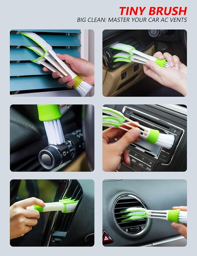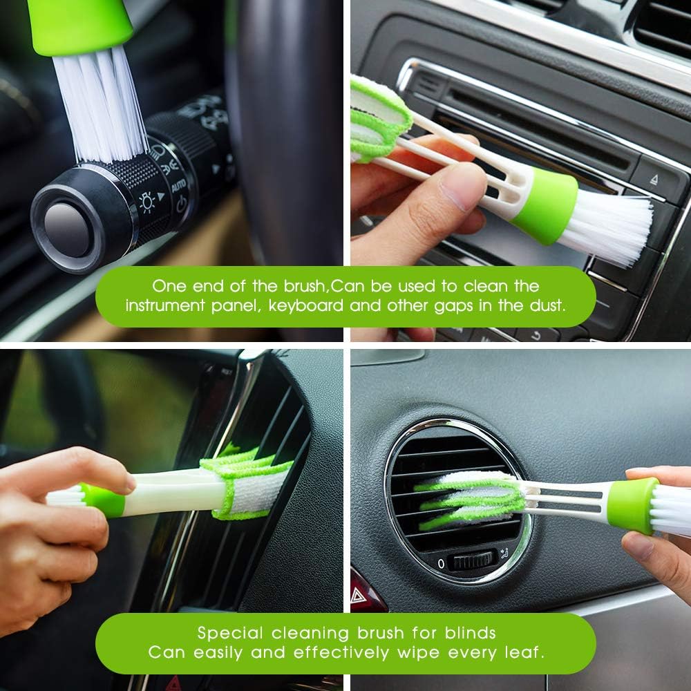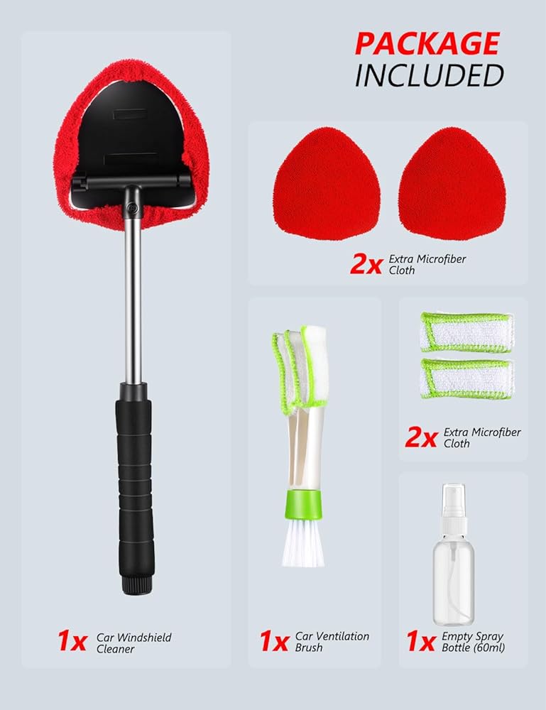 تشمل العبوة: 1 × منظف الزجاج الأمامي، 1 × منفضة فتحات تهوية الهواء، 3 × قطعة قماش من الألياف الدقيقة قابلة للغسل وإعادة الاستخدام، 1 × زجاجة رذاذ سعة 60 مل.