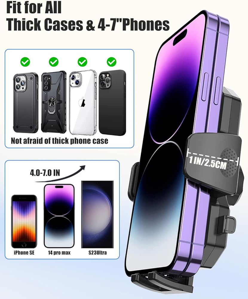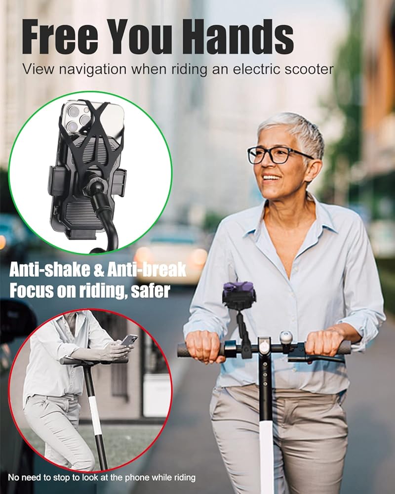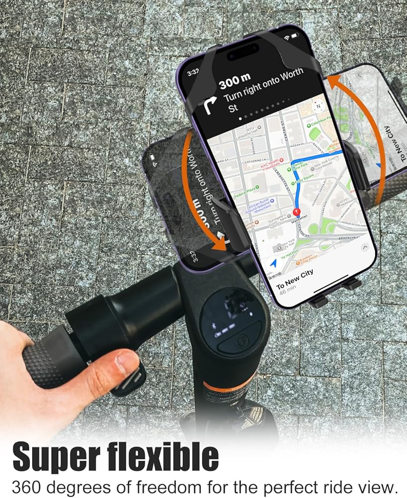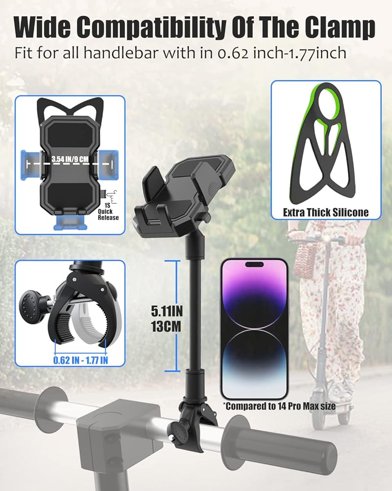 【توافق واسع】مشبك قابل للتعديل لتثبيت الهاتف على سكوتر كهربائي يناسب جميع الأجهزة مقاس 4-7 بوصة. حجم المشبك 2.16-3.54 بوصة (5.5-9 سم)، السمك 1 بوصة (2.5 سم)، مما يجعل المشبك يعمل مع أو بدون حافظة ويمكن تثبيته بإحكام. متوافق مع 99% من الهواتف المحمولة في السوق، مثل 15 Pro Max/15 Pro/15/15 mini، iPhone14 Pro Max/14 Pro/14 Plus/14، 13 Pro Max/13 Pro/13/13 mini، 11 برو ماكس/11 برو/11، XS ماكس، XS، XR الخ؛ سامسونج جالاكسي S23/S23 Ultra/S23+، S22/S22 Ultra/S22+ إلخ؛ هواوي، إل جي، الخ.