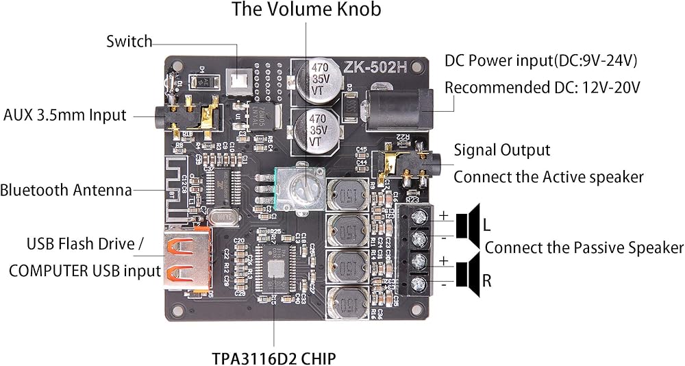 【ما هي الشريحة التي تستخدمها؟ 】 ZK-502H Bluetooth AMP يعتمد شريحة TPA3116D2، والتي يمكن أن تصل طاقة الذروة إلى 50 وات + 50 وات.