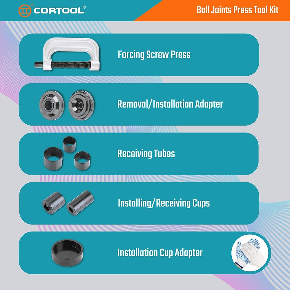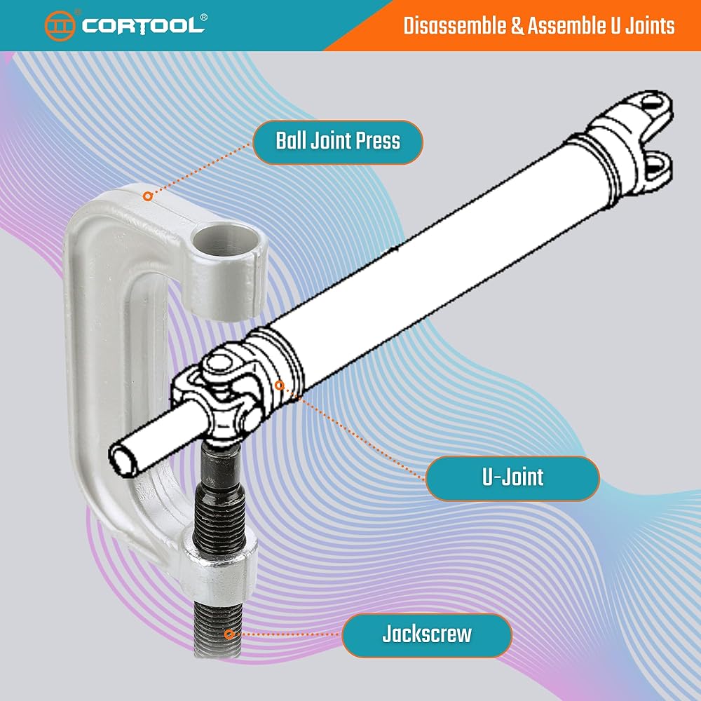 👍 يمكنك بسهولة إزالة المكونات الملائمة للضغط مثل المفاصل الكروية والمفاصل على شكل حرف U ودبابيس تثبيت الفرامل من معظم مركبات الدفع الثنائي والدفع الرباعي، دون الحاجة إلى إزالة ذراع التحكم، باستخدام أداة الضغط على وصلة الكرة CORTOOL / أداة إزالة البطانة جنبا إلى جنب مع محول 4WD.