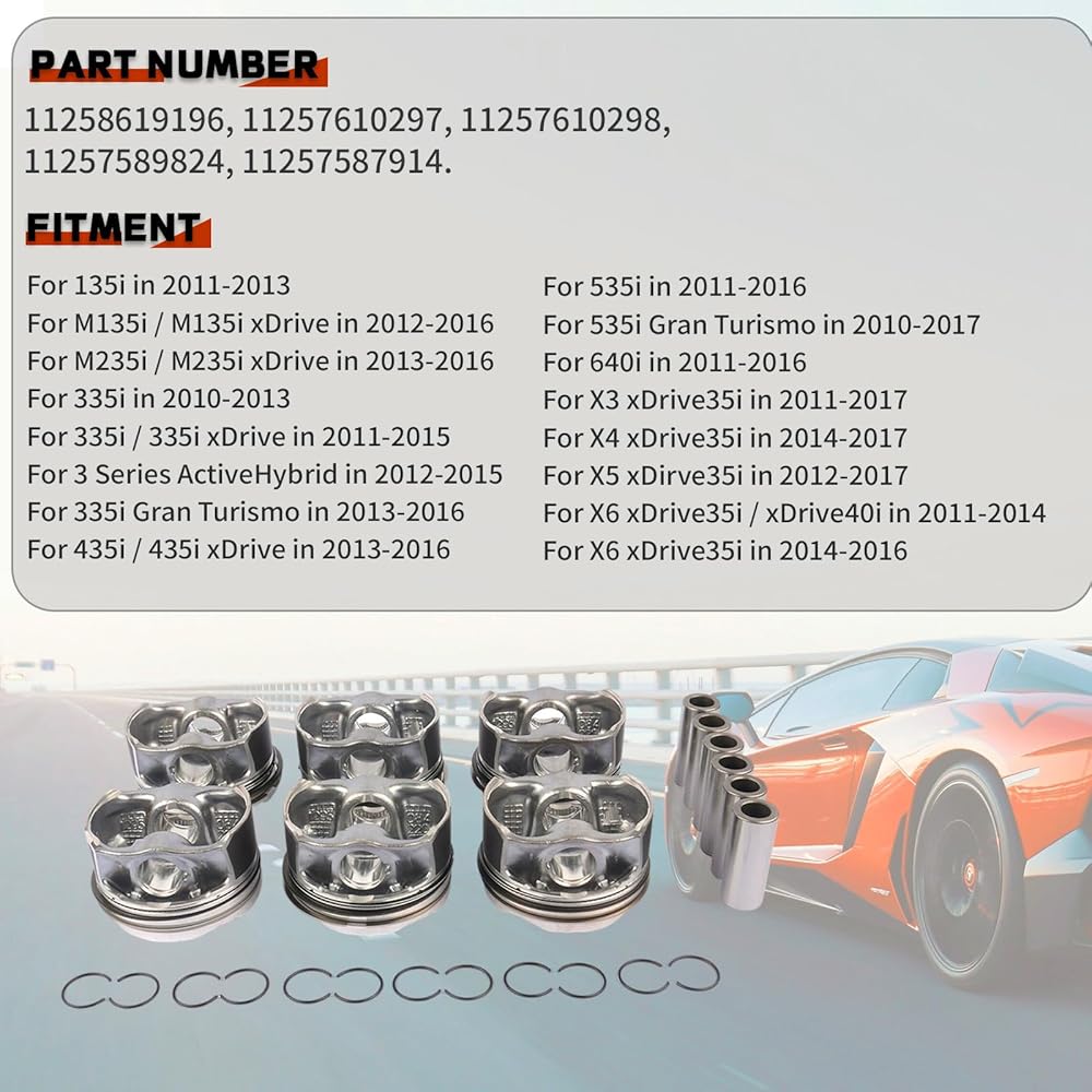 • 🚘【VEHICLE FITMENT】11257587914 Pistons & Rings Kit fit for 135i 2011-2013, M135i / M135i xDrive 2012-2016, M235i / M235i xDrive 2013-2016, 335i 2010-2013, 335i / 335i xDrive 2011-2015, 3 Series ActiveHybrid 2012-2015, 335i Gran Turismo 2013-2016, 435i / 435i xDrive 2013-2016, 535i 2011-2016, 535i Gran Turismo 2010-2017, 640i 2011-2016, X3 xDrive35i 2011-2017, X4 xDrive35i 2014-2017, X5 xDirve35i 2012-2017, X6 xDrive35i / xDrive40i 2011-2014, X6 xDrive35i 2014-2016.