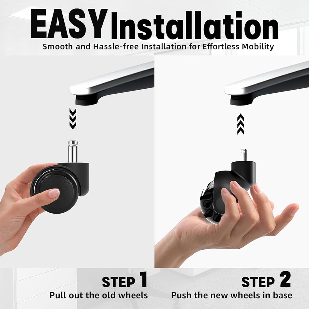 🥇 عجلات كرسي مكتب مطورة - مجموعة من 5 عجلات دوارة ممتازة لانزلاق سلس وسهل. مقاس العمود العالمي: 7/16 بوصة عرض × 7/8 بوصة ارتفاع (11 × 22 مم)، يناسب 99% من الكراسي (باستثناء كراسي IKEA وTopstar). أسود