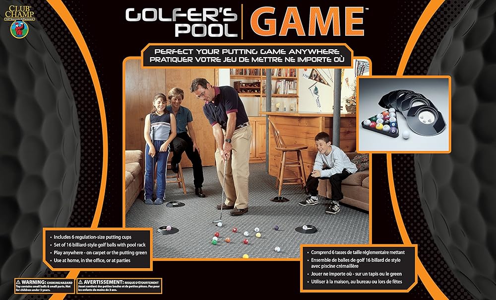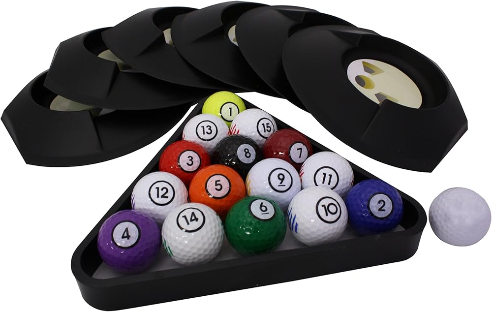 Putter Pool golf putting game plays like golf and shoots like pool. Game includes six putting cups and full rack of billiard style golf balls