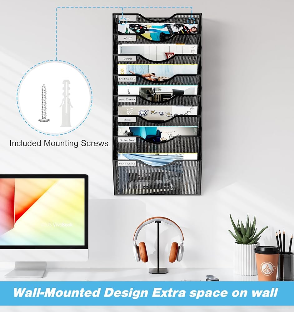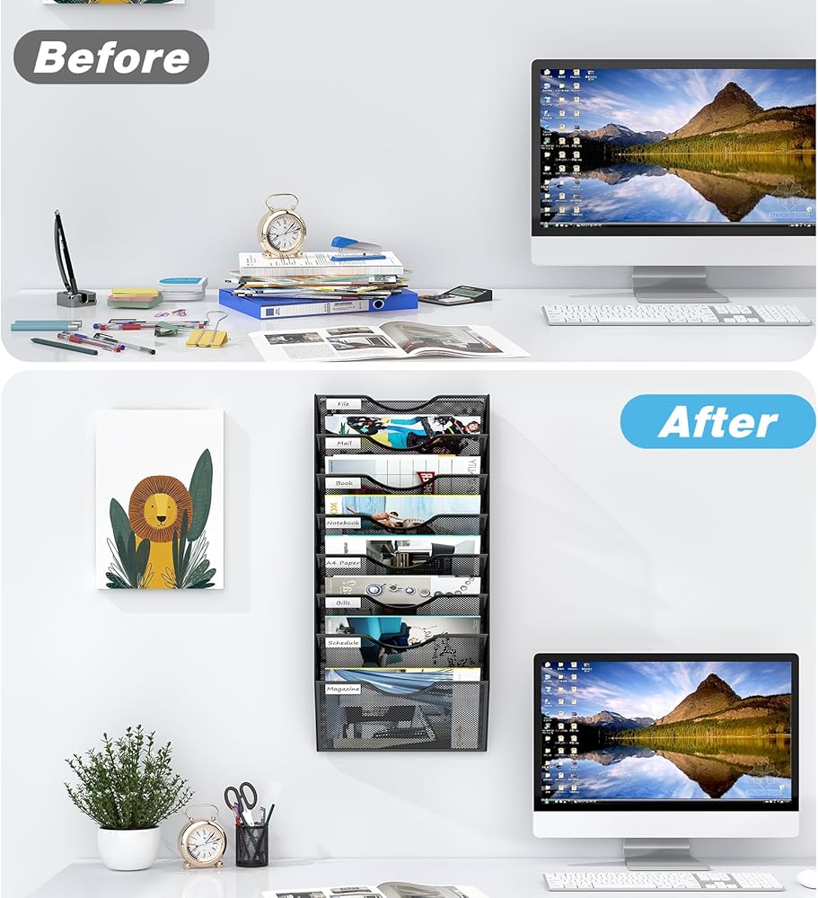 Space Save : This wall file organizer has 10 separate cascading slots,each pockets has a TAB slot and a panel with small tabs to sort your files for easy access. Maximize your vertical space, keep your desk clean, feel good, and increase productivity