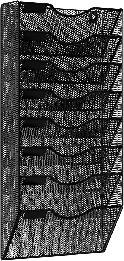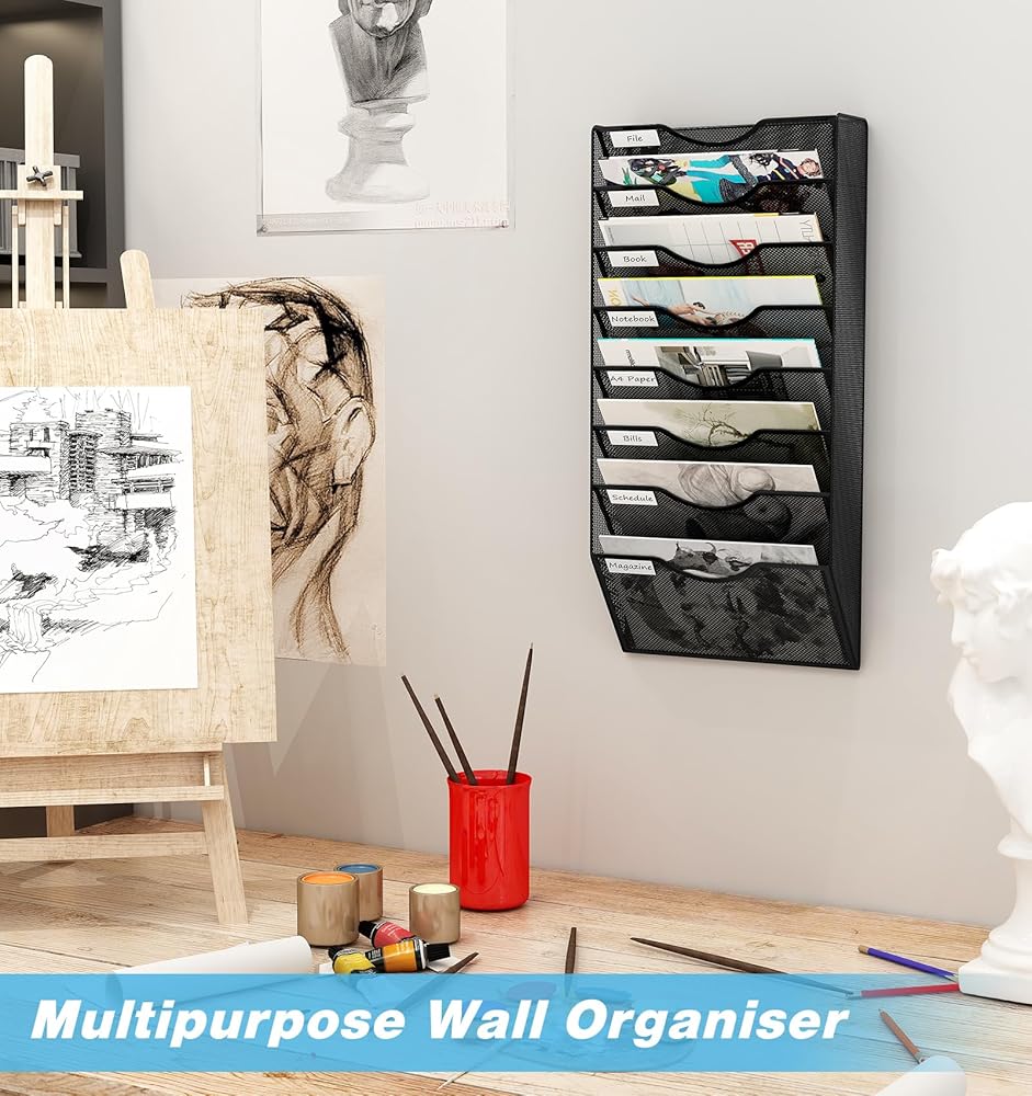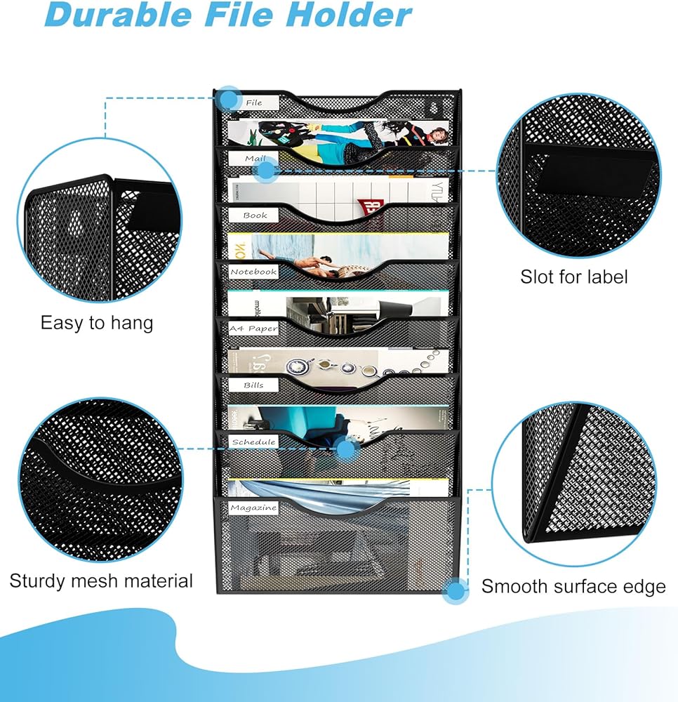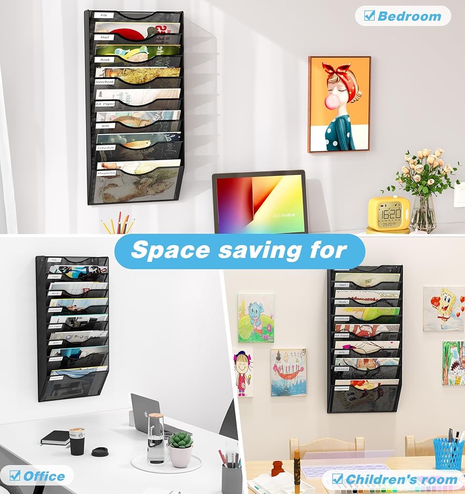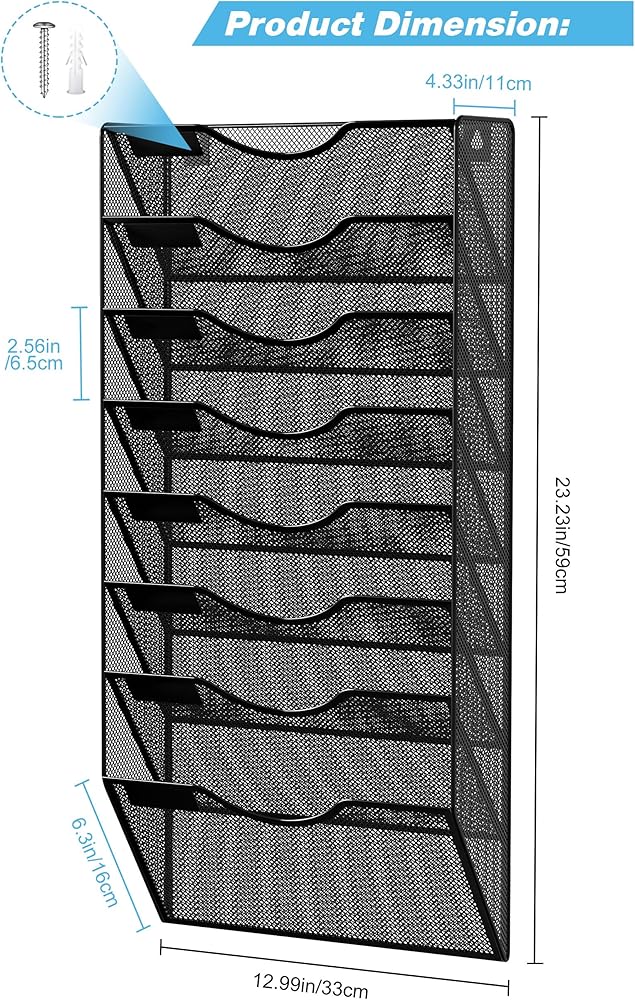 This wall file holder is made of sturdy steel and good flexible mesh, it is enough for your purpose, the edges of the wall file organizer are polished and wrapped, it is very smooth, it will not scratch your hands, and it is very safe and secure to use.Use in the office to store files, magazines, A4 papers, bills, clipboard, letters and etc, it also can fit in kids' rooms to hang cartoon books, comics, and teach books, for school to help teacher organizer desk stationary supplies.