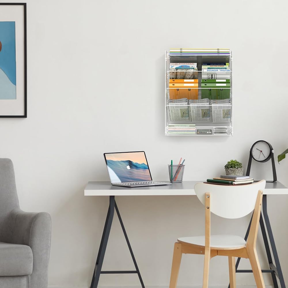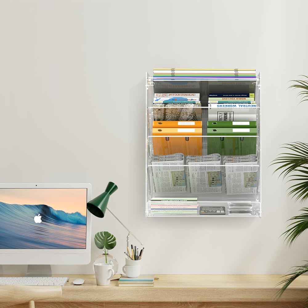 توفير المساحة: يشتمل التخزين الرأسي المثبت على الحائط على 4 طبقات من الأرفف المائلة لتنظيم الملفات والبريد والمجلات والكتيبات وغيرها من العناصر. يمكن للصينية الأفقية السفلية أن تحتوي على دباسات صغيرة وملاحظات لاصقة وشريط وغيرها من الأدوات المكتبية الشائعة الاستخدام، مما يساعد على زيادة مساحة التخزين إلى أقصى حد.