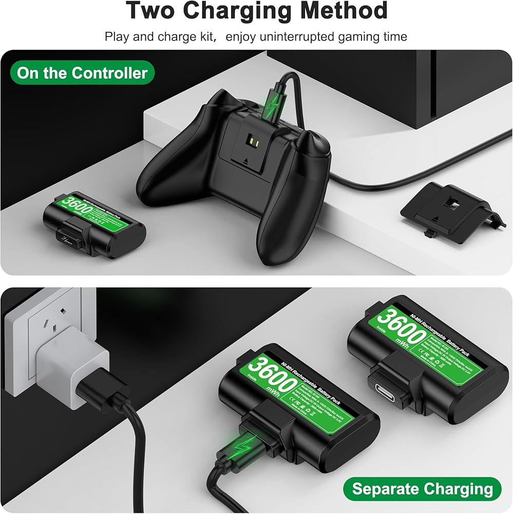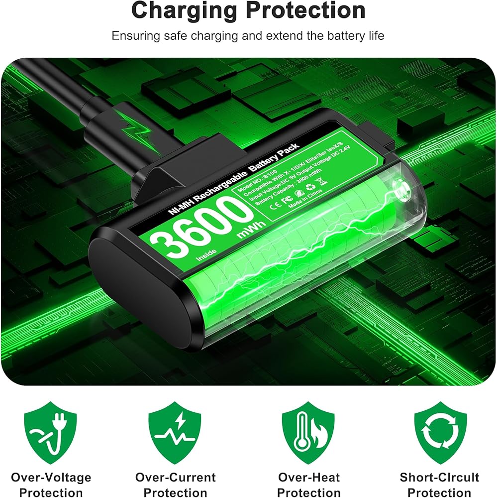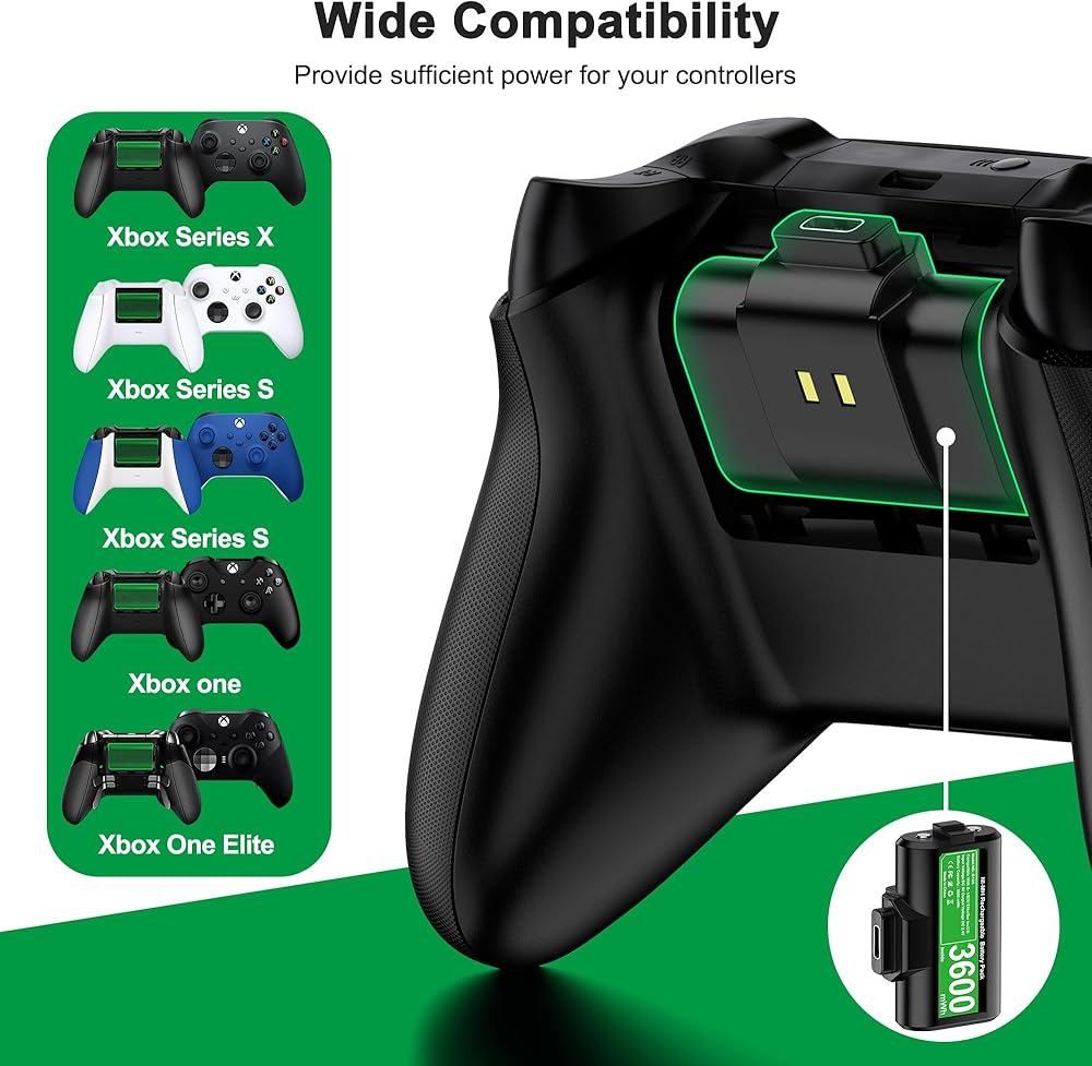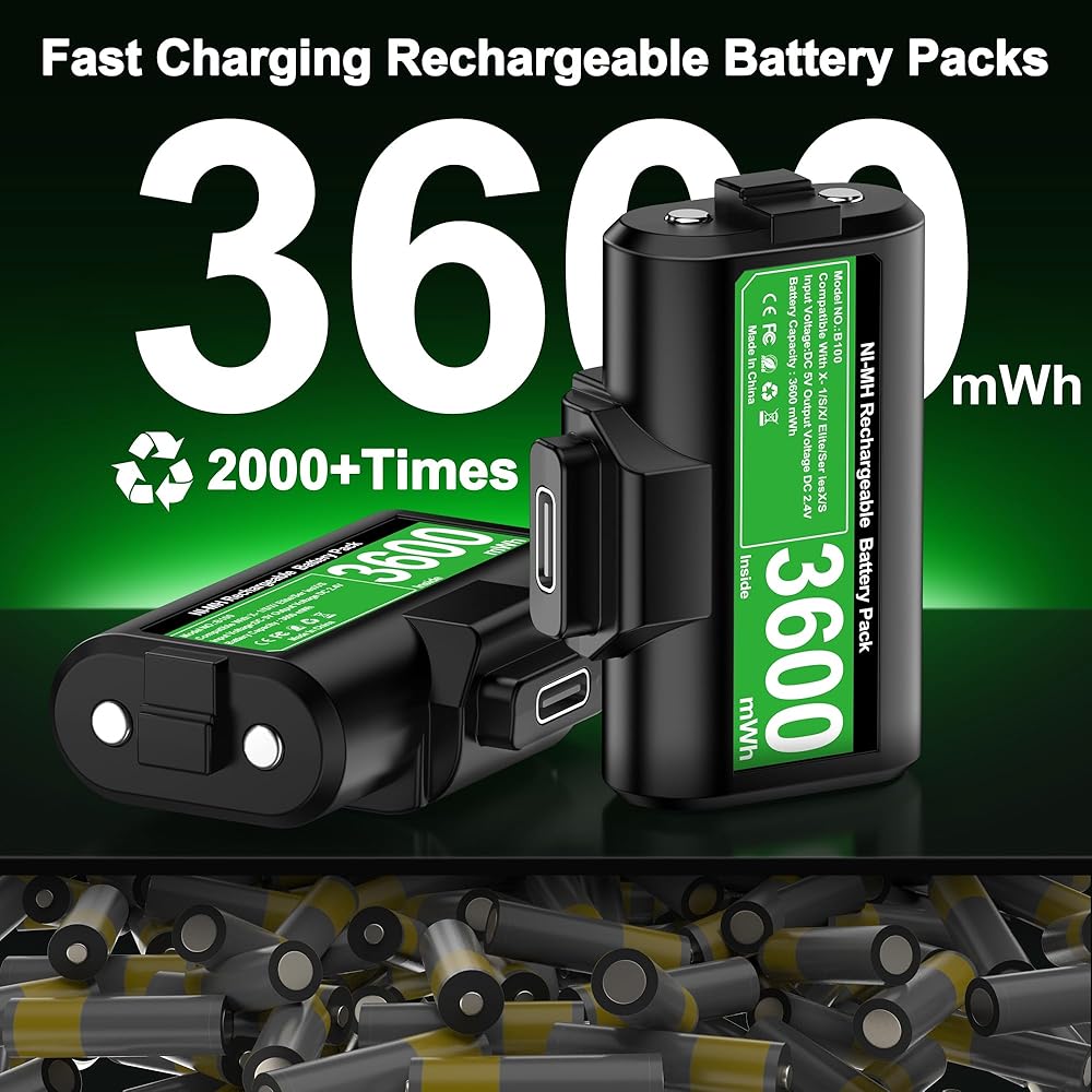 • 【2 × 3600 مللي واط في الساعة لجهاز Xbox القابلة لإعادة الشحن】مع وقت شحن يصل إلى 4 ساعات، توفر كل بطارية وقت تشغيل مثير للإعجاب يتراوح من 8 إلى 12 ساعة. استمتع بمصدر طاقة ثابت وجاهز للاستخدام، مما يلغي الحاجة إلى تبديل البطارية في منتصف جلسة اللعب.