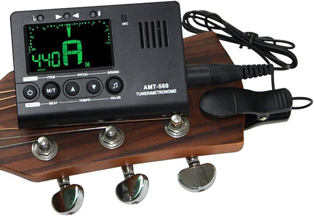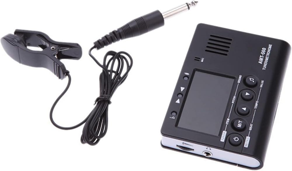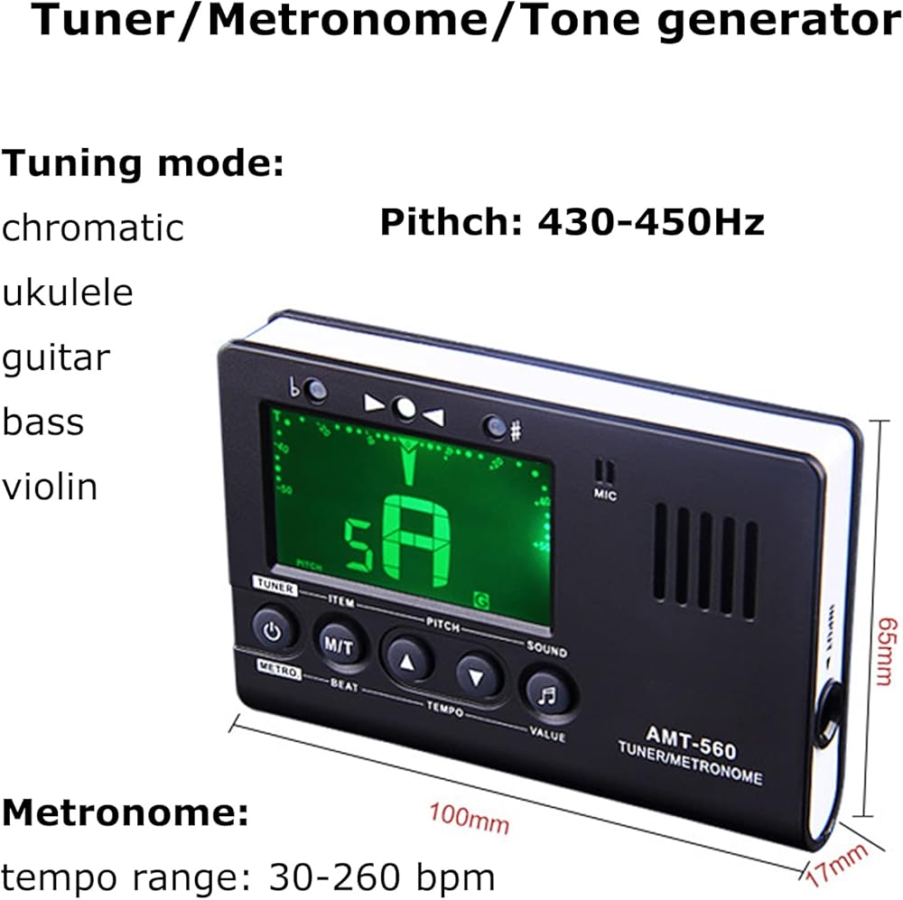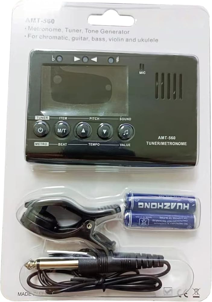 Digital metronome tuner for Chromatic/Guitar/Bass/Ukulele/ViolinTwo-clor Backlight Screen:Green-in tune,white-out of tune. Package List:2 x AAA Battery 1 x Chromatic Tuner1 x Piezo pickup Specifications TUNER Tuning items: Chromatic, Guitar, Bass, Ukulele, Violin Detection range: A0(27.5Hz)-C8(4186Hz) Pitch range: 430Hz-450Hz Tuning accuracy: ±0.5 cent METRONOME Tempo range: 30bpm-260bpm Beats: 1, 2, 3, 4, 5, 6, 7, 8, 9 If there is no signal inputs in 3 minutes after the power is on, the AMT-560 will turn off automatically. Precautions: Avoid use in direct sunlinght,extreme temperature or humidity,excessive dust,dirt or vibration or close to magnetic fields. Be sure to power off the unit when not in use and remove the battery for extended periods of inactivity. Radios and televisions placed nearby may experience reception interference. For cleaning,wipe a clean, dry cloth.Do not use flammable liquid cleaners such as banzene or thinner.
