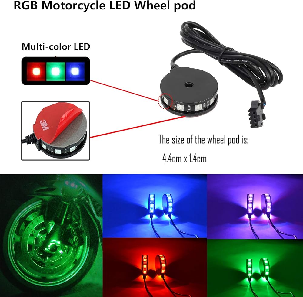 • مجموعة جراب LED لعجلة الدراجة النارية RGB متعددة الألوان للركوب الليلي، ضوء حافة عجلة الدراجة النارية هو DC 12V، 9 LED، مقاوم للماء، متوفر بألوان متعددة بواسطة جهاز التحكم عن بعد rgb، أبيض، أزرق، أحمر، وردي أو أخضر، أرجواني، أصفر، برتقالي إلخ .