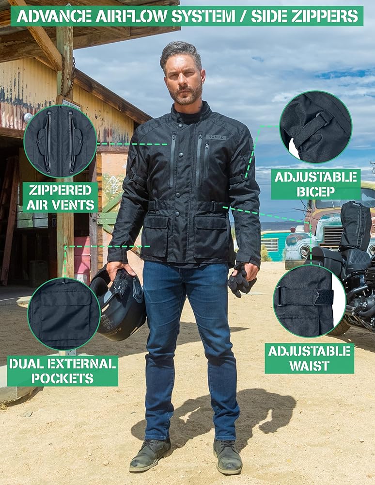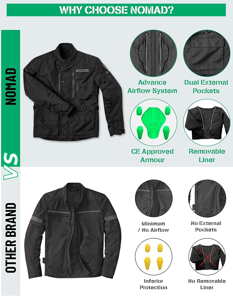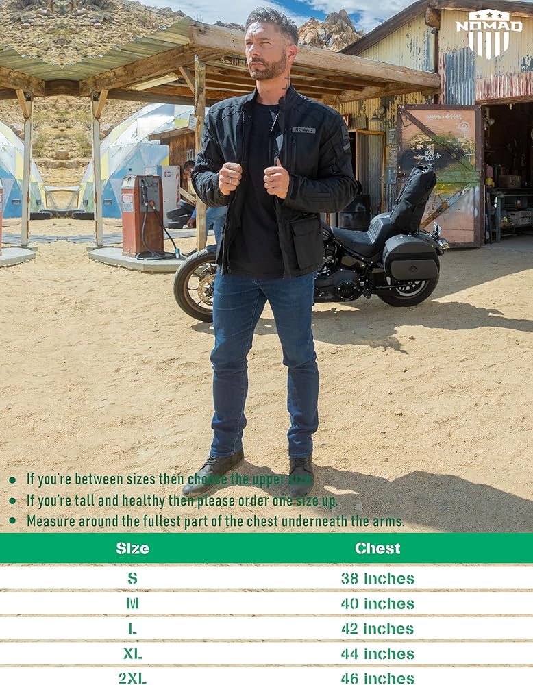 AFFORDABLE QUALITY: Nomad touring motorcycle jackets for men are made from high-quality materials yet comes at an affordable price; this all-weather motorcycle touring jacket with armor can come in the following sizes: small, medium, large, extra large, 2XL, and 3XL; this men's motorcycle jacket can fit riders as short as 4'10” and weighing 95 lbs to as tall as 6'4” and weighing 285 lbs; the low pricing and size variety ensures accessibility to a range of riders of various body types and ages.