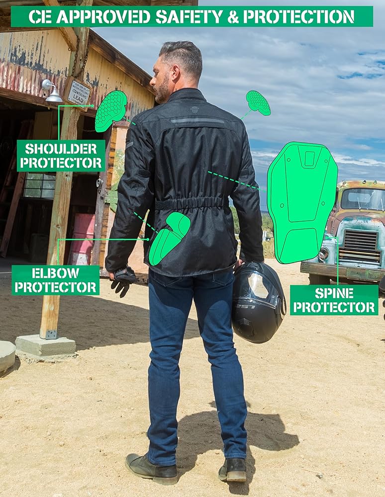 CE APPROVED PROTECTION: Men's motorcycle jacket with armor is fitted with padding at the shoulders, elbows, and spine to help protect you from suffering severe injuries; in case of a collision or accident, the padding will reduce impacts or abrasions you may suffer if thrown over your motorcycle's handlebars; at the front and back of this motorcycle adventure jacket with armor is reflective piping that catches dim light and ensures visibility at night to other vehicles from every direction.