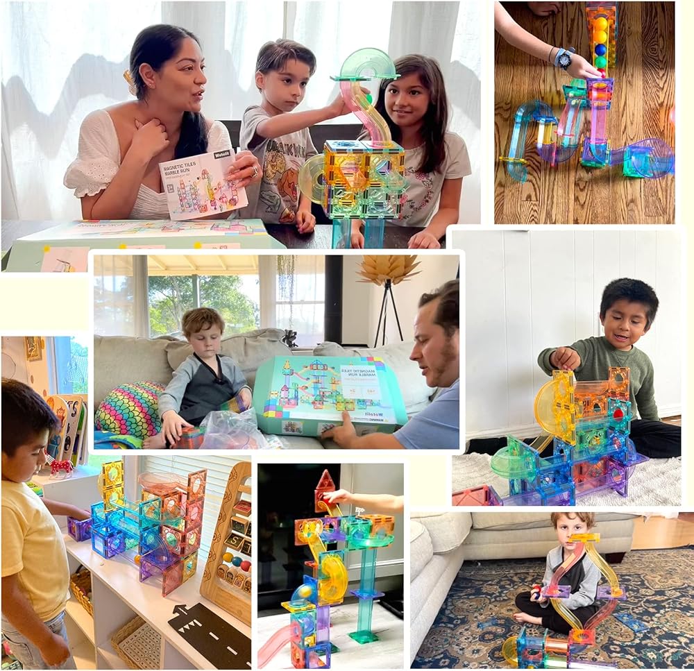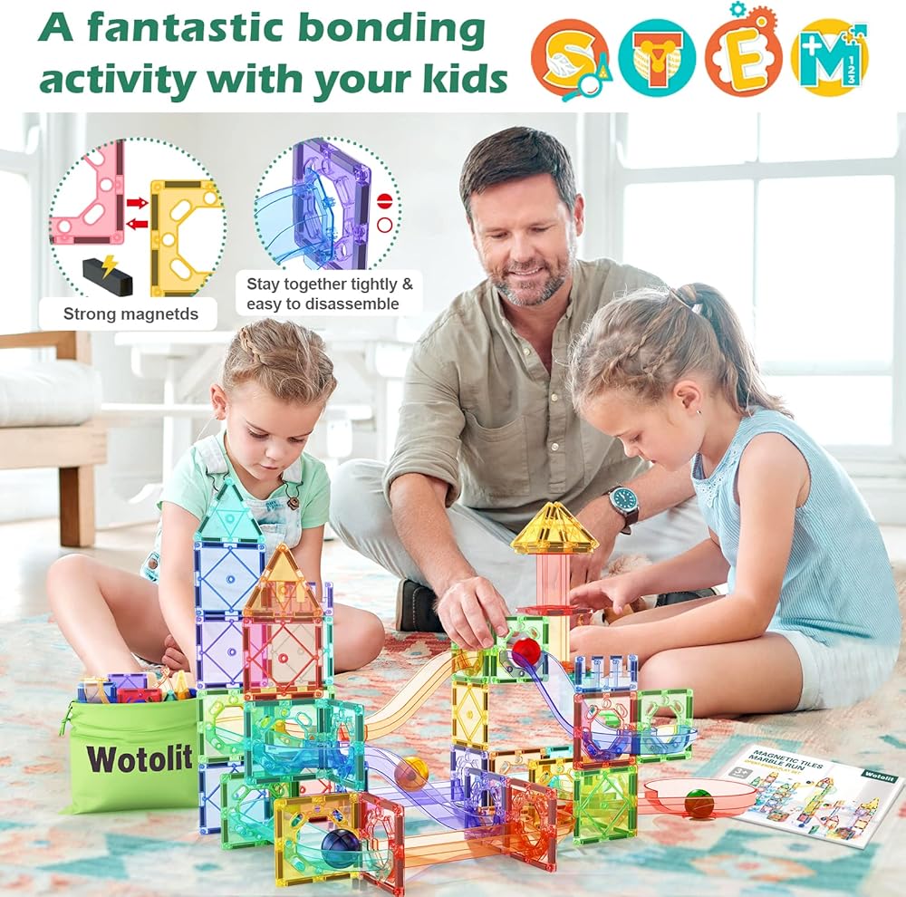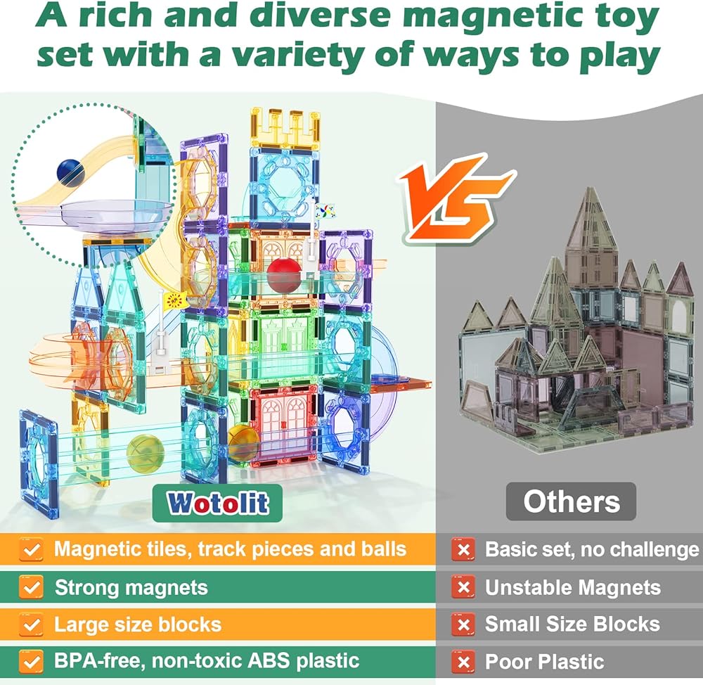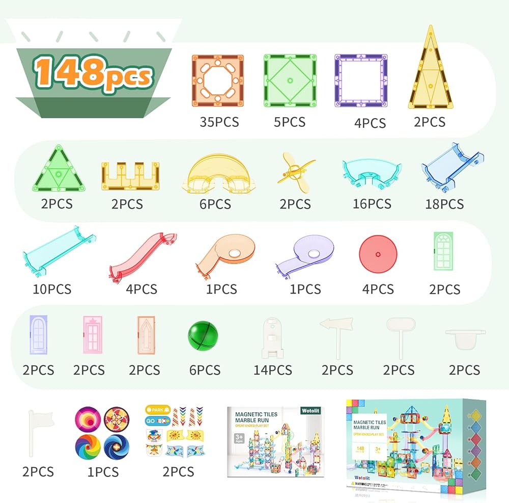 🎁 148pcs Advanced Toys set : With 50 magnetic tiles, 6 large balls, 56 clear smooth-run track pieces and 36 accessory sets , our kit has countless imaginative configurations. This construction kit is designed to fit together snuggly so your marble maze won't fall apart while you play. Experience the excitement of watching marbles race down the track with Wotolit marble run playset!