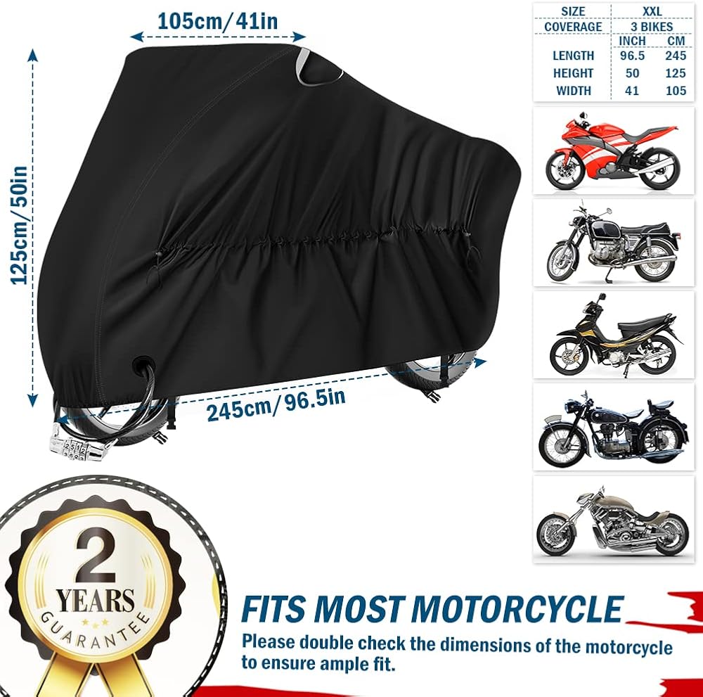 【2 سنة الضمان! 】في حالة وجود أي مشاكل مع غطاء دراجتك النارية، فسنقوم بإصلاحه أو استبداله دون أي تكلفة. مقاس غطاء الدراجة النارية هو 245*105*125 سم/96.5x41x50 بوصة، يرجى التحقق مرة أخرى من أبعاد غطاء مركبة الدراجات النارية لضمان ملاءمة كافية. نحن نؤمن بأن هذا المنتج سوف يلبي جميع توقعاتك.