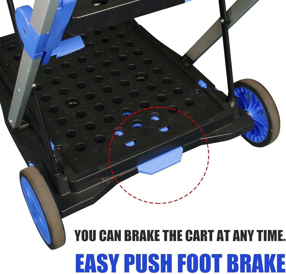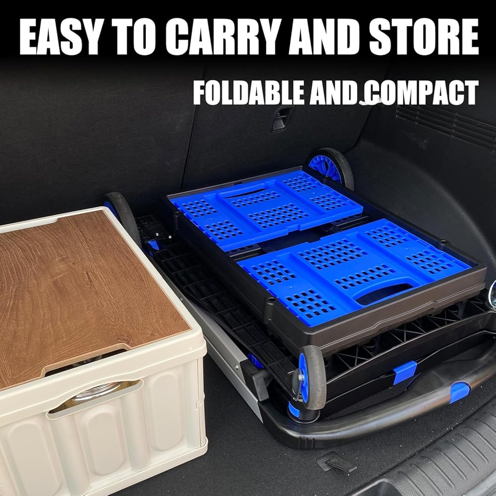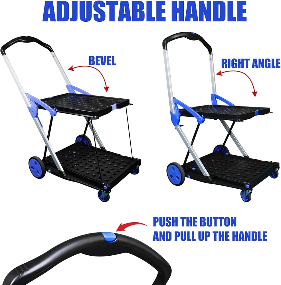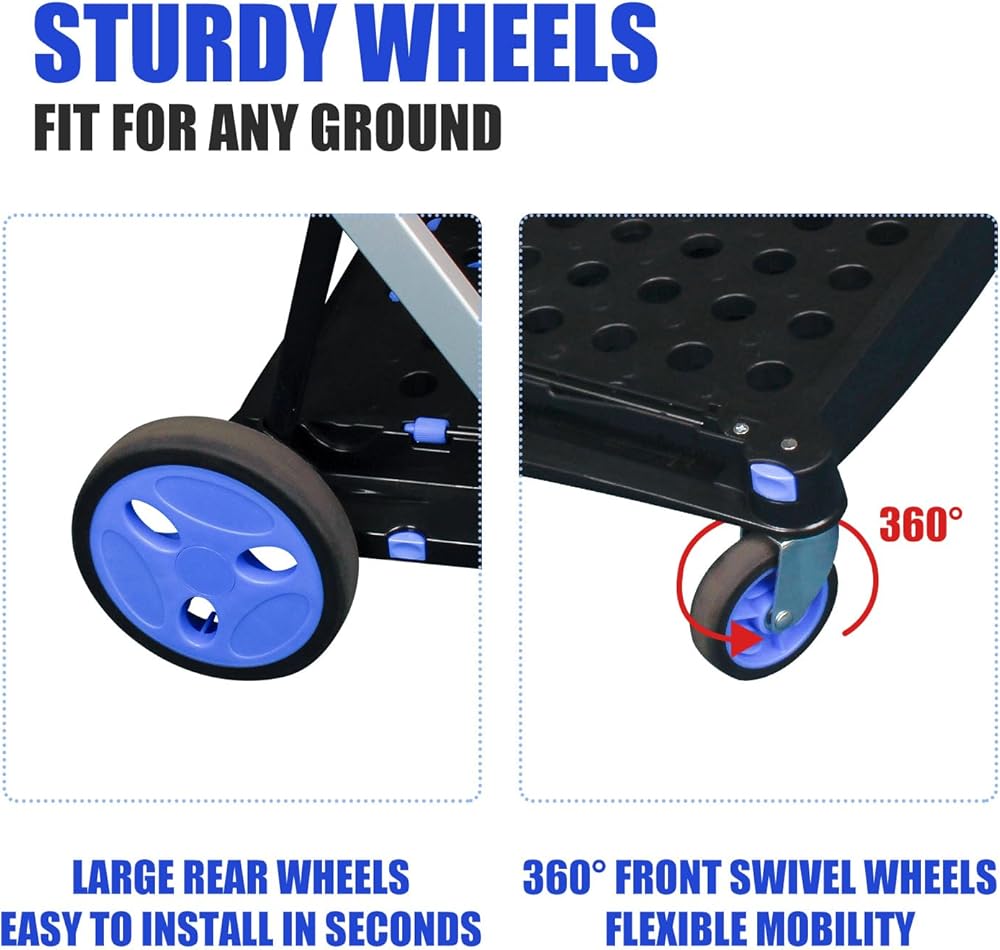 سهلة الطي والفتح --- حجم العربة المطوية هو: 28.8 × 21.8 × 4.2. فقط اضغط على زر ويمكنك فتح العربة أو طيها بسهولة. عند عدم الاستخدام، يمكن طي عربة الأدوات بالكامل يتم طيها بشكل مسطح ووضعها في السيارة، أو غرفة التخزين، أو المستودع، إلخ.