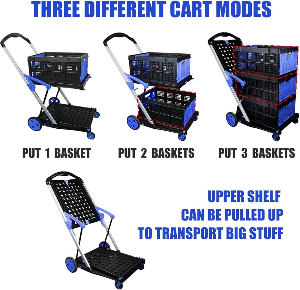 تأتي مع صندوق --- تأتي عربة التسوق مع صندوق تخزين قابل للطي. الصندوق مصنوع من مادة البولي بروبيلين عالية الجودة وله هيكل قوي، لذلك لا يتشوه بسهولة عند الاستخدام. يمكن لحزام التثبيت الموجود على العربة تثبيت صندوق التخزين على الرف العلوي.