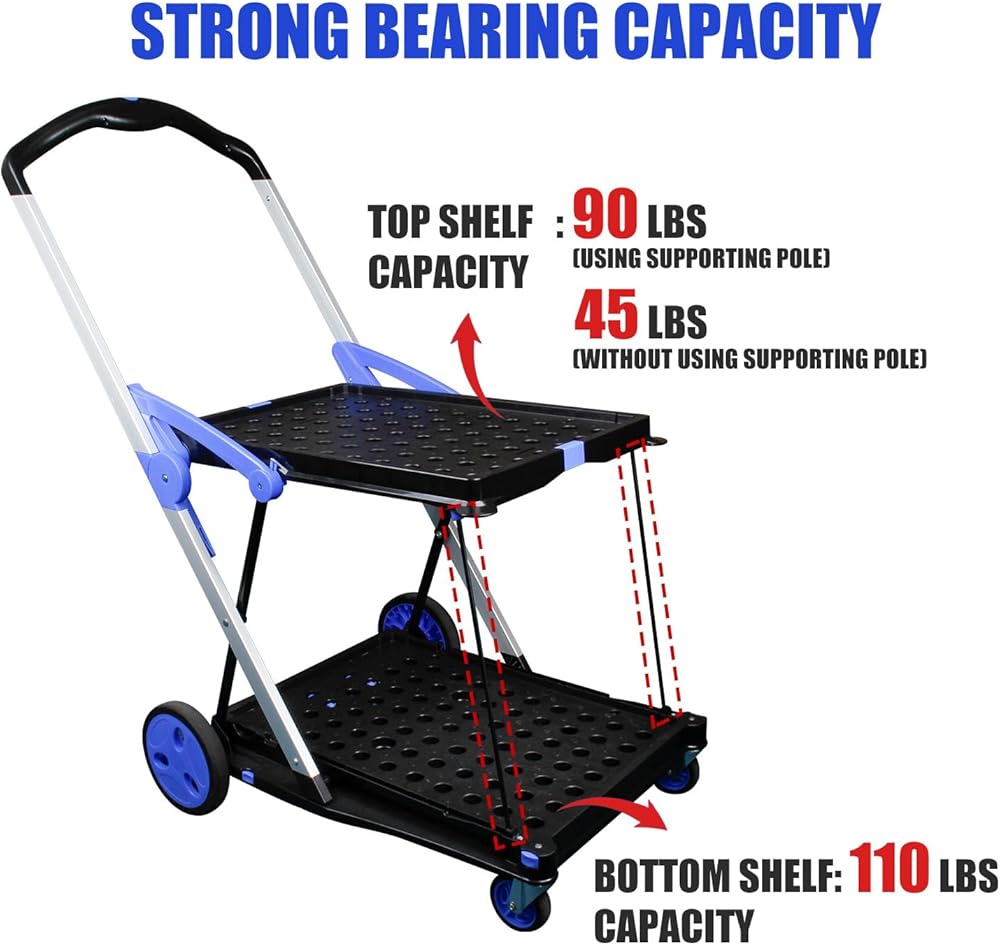 هيكل متين --- عربة التسوق هذه مصنوعة من سبائك الألومنيوم والبلاستيك عالي الجودة. الرف مصنوع من بلاستيك البولي بروبيلين السميك لمزيد من الدعم والثبات. إنها مناسبة جدًا للتسوق والحديقة والمطاعم والمستودعات والمكتبة والمكاتب وما إلى ذلك.