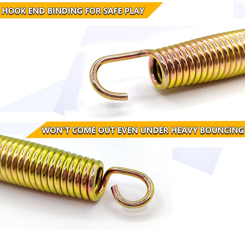 - Trampoline springs feature slightly curved hooks on both sides, providing high tensile strength and a secure hold on the trampoline, preventing users from falling while jumping.
